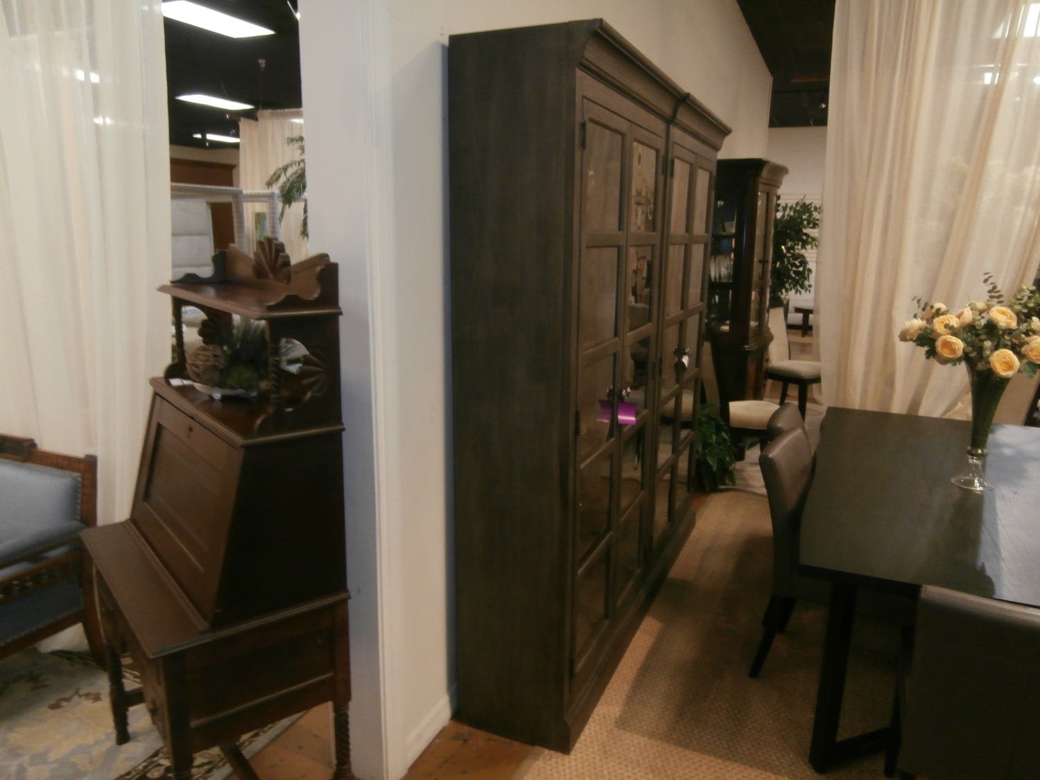 The Hooker Vintage West Bunching Curio is a sophisticated display cabinet found in a dark charcoal finish. Designed for versatility, this unit can be used alone or combined with another. Measures 40"W,17"D,84"H.