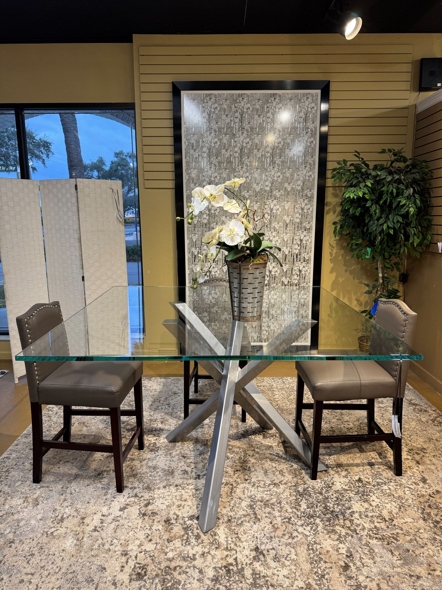 Modern glass top pub table on sculptural silver metal base. Beautiful thick glass. Great find! 60"square x 37"high.