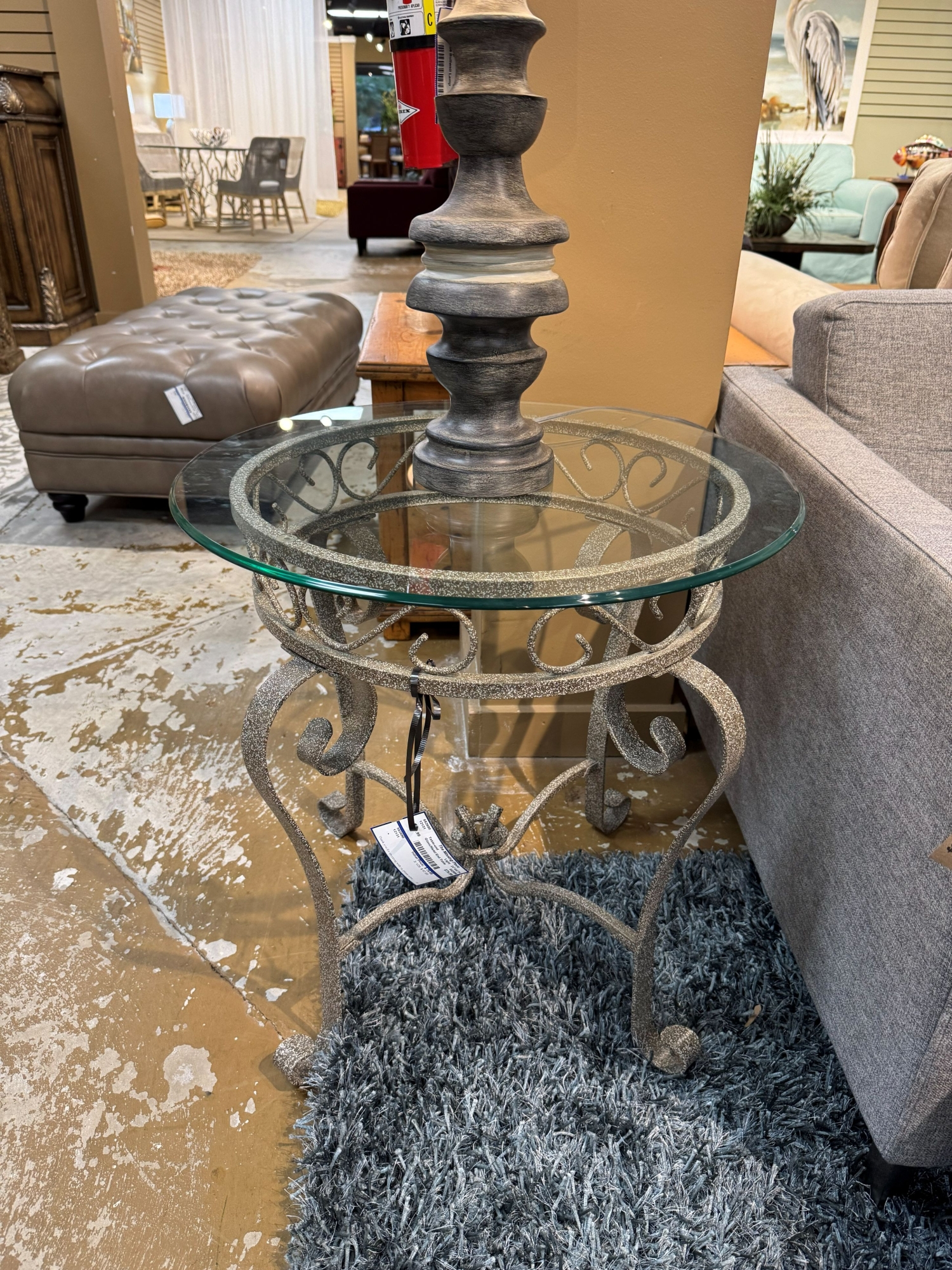 Item #551549. Glass top end table on distressed gray metal legs. 24"square x 23"high. At posting, we have the matching coffee table.