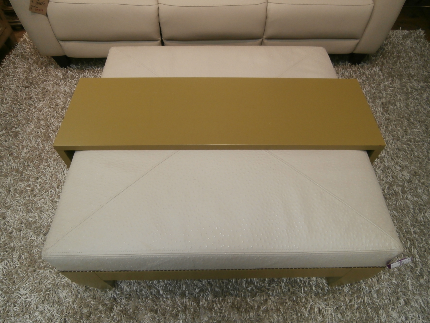 Lorts leather coffee table ottoman measuring 40"W,40"D,18"H in olive and creme.