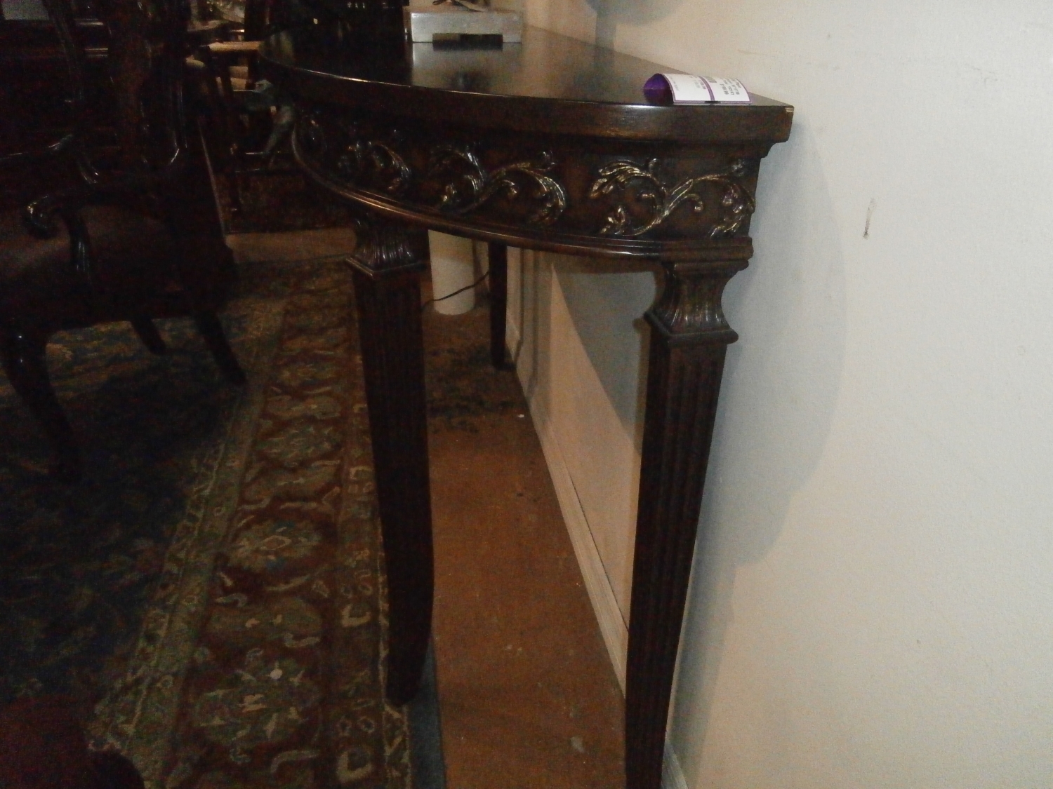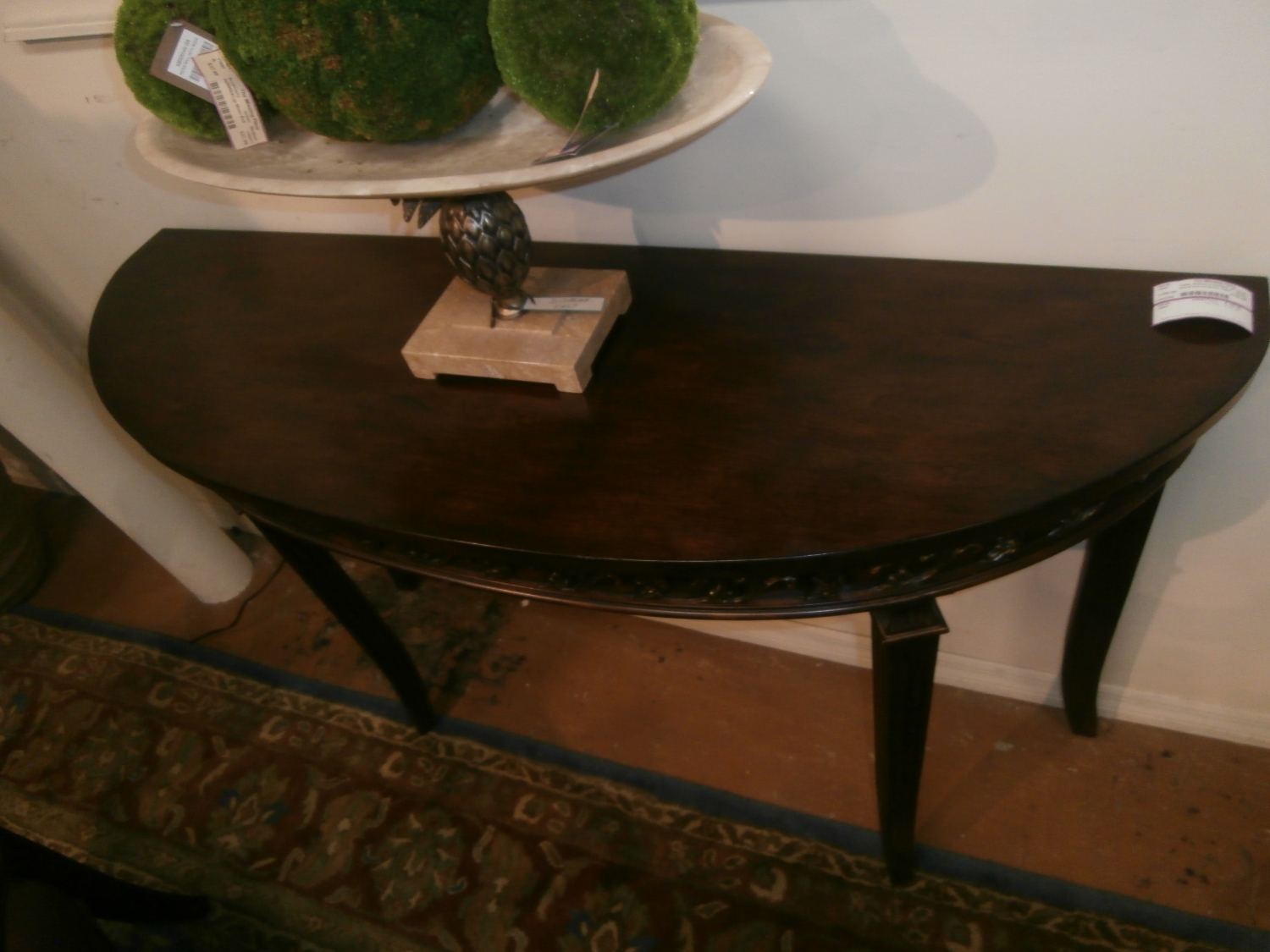 Wood carved demi lune entry/console table measuring 56"W,18"D,36"H in mahogany.