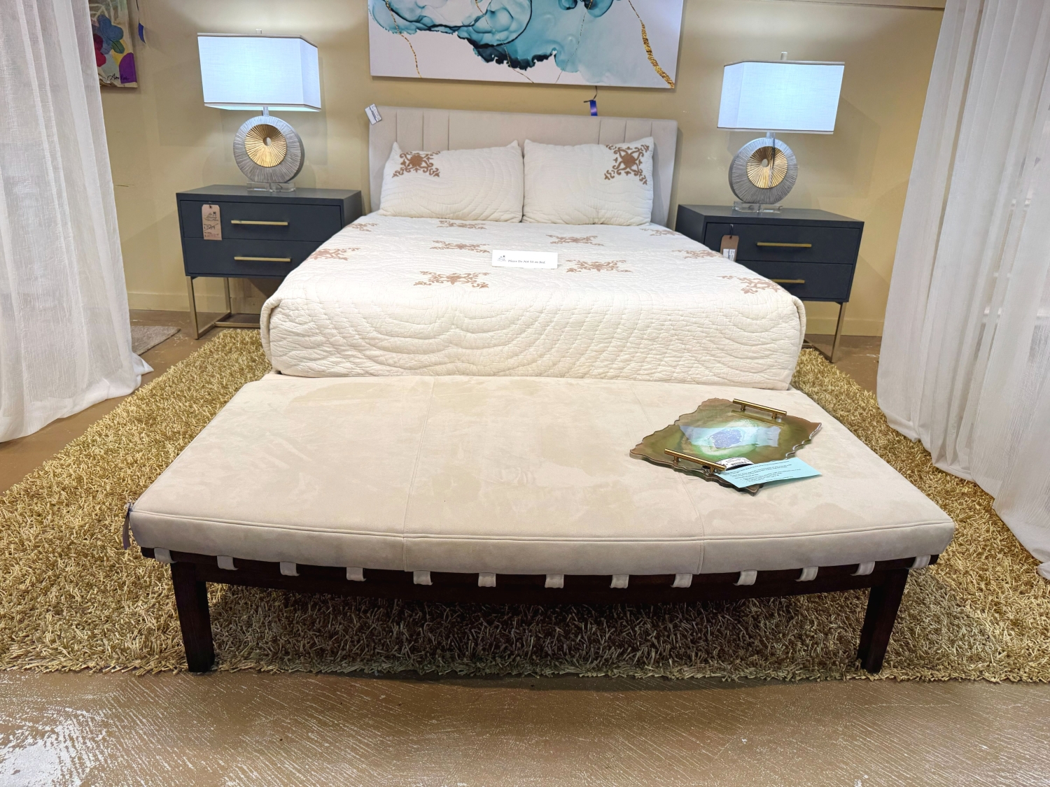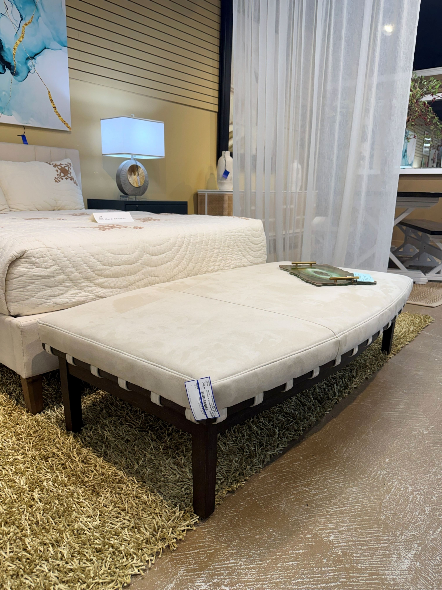 Beautiful Hancock & Moore Zelis bench with cream suede top on dark wood frame. 59"long x 34"deep x 16"high.