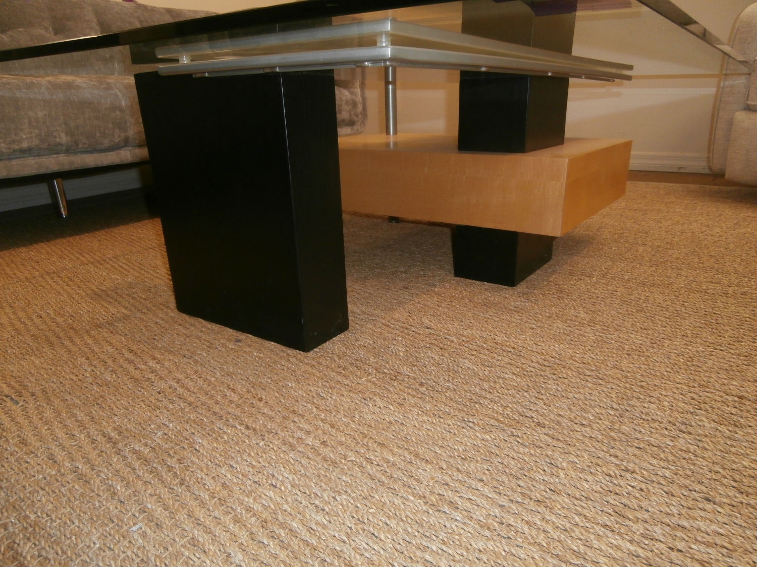 Modern funky coffee table like the old Galloways style. Measures 50"W,36"D,16"H in tan and black. Matching end table at post.