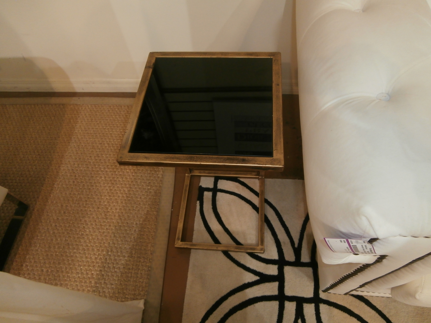 This Zafina table features a lightly antiqued gold iron frame and a black tempered glass top. Designed for small spaces, it offers a chic, modern, and high-style aesthetic suitable for living rooms or bedrooms. 13"W,13"D,25H