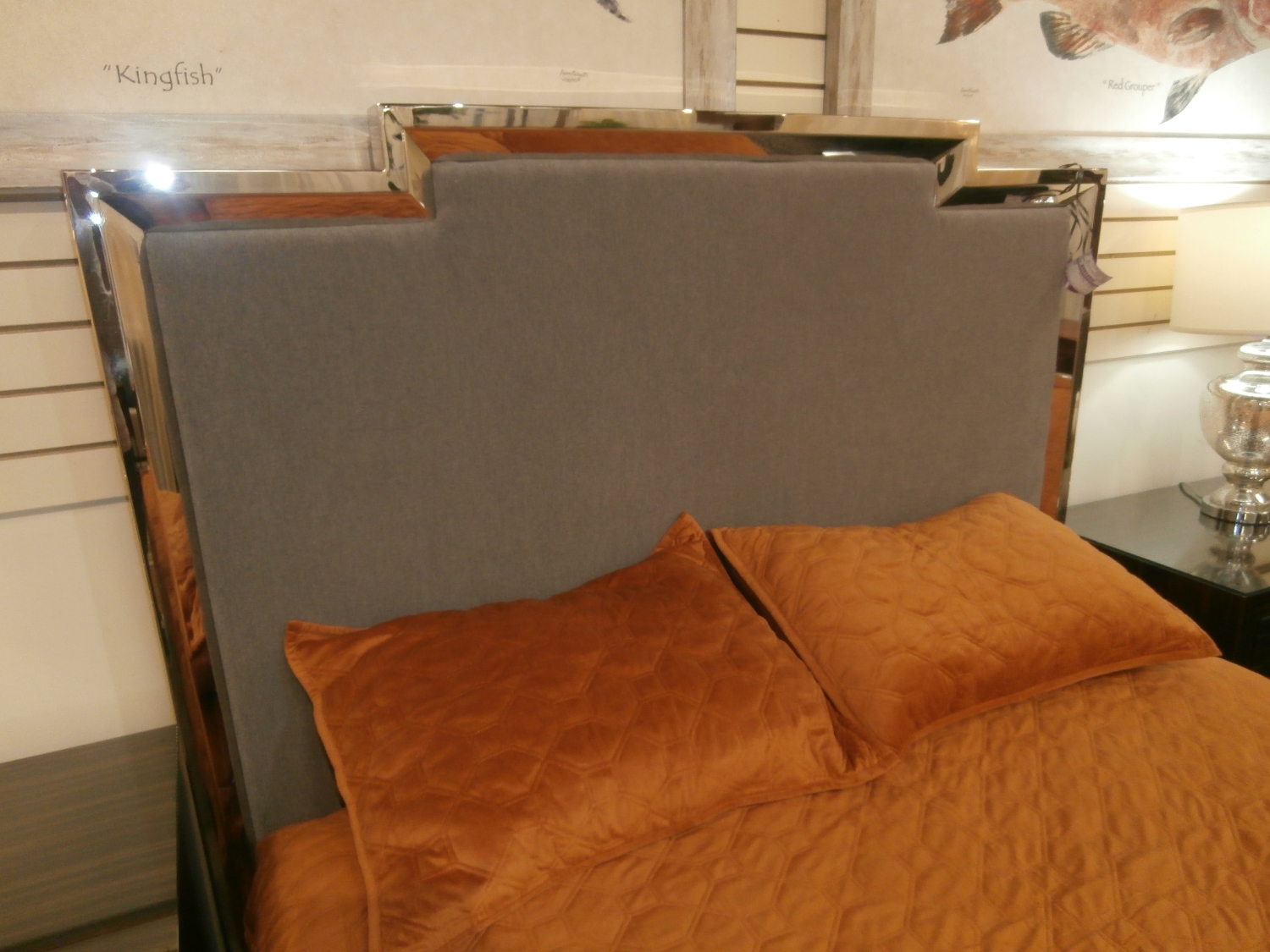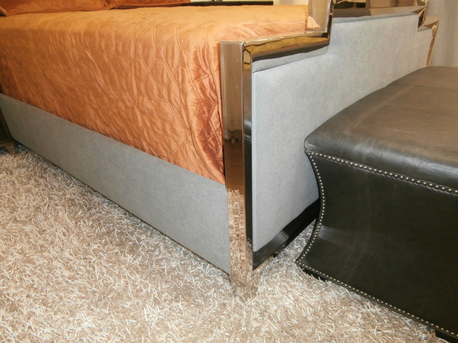 Bernhardt Criteria queen bed with radiant nickel finish and upholstered panel on front and back of footboard.
