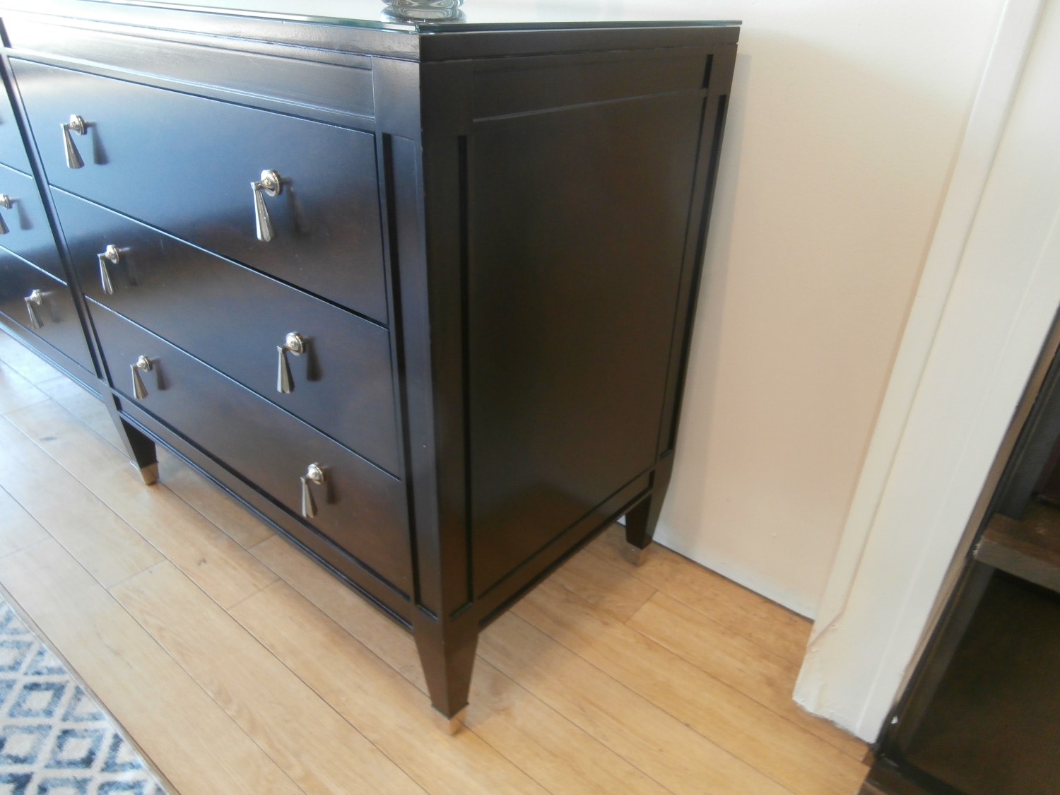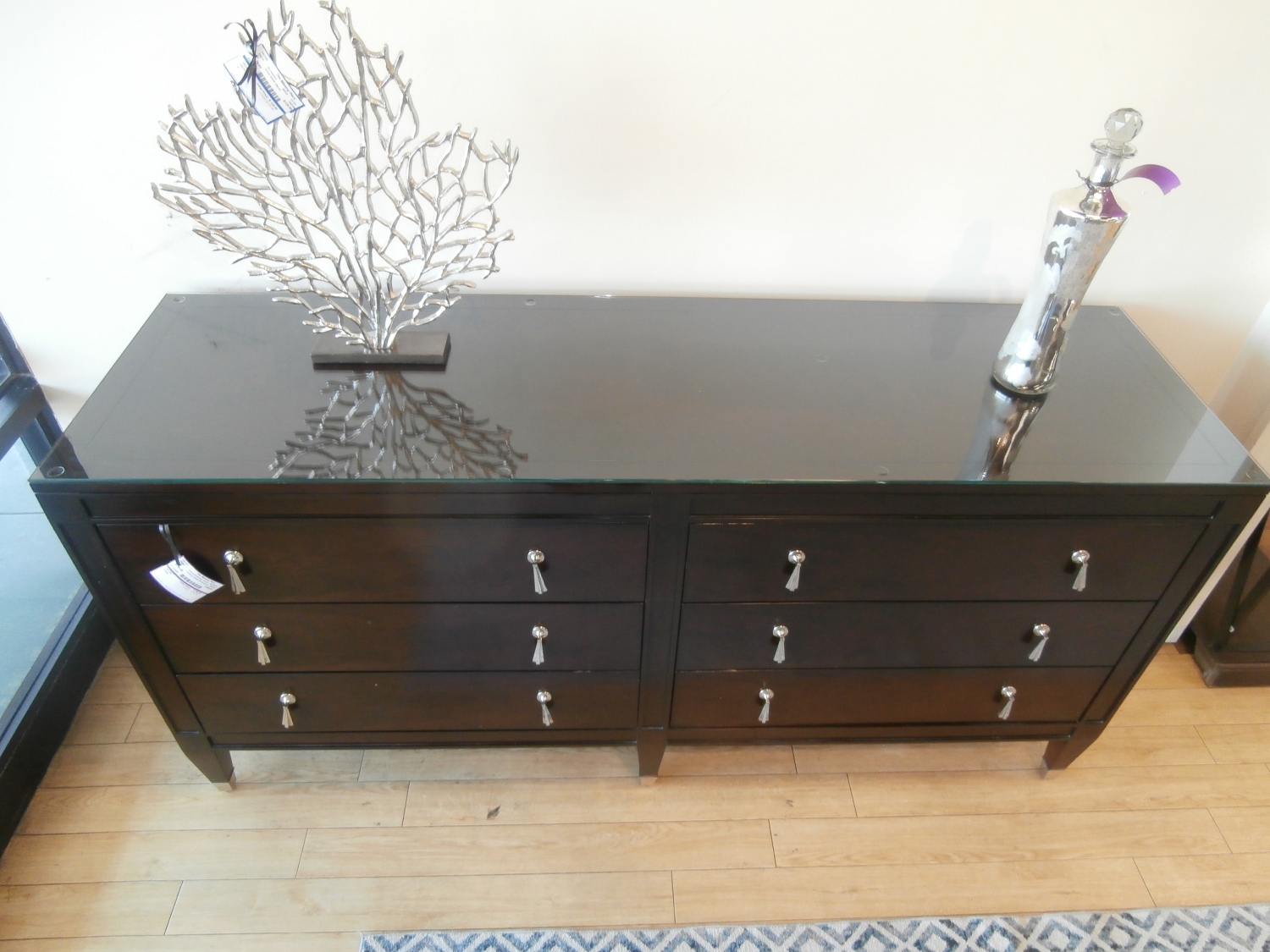 Century chest of six drawers with shiny metal pulls and feet. Measures 68"W,20"D,33"H in brown.