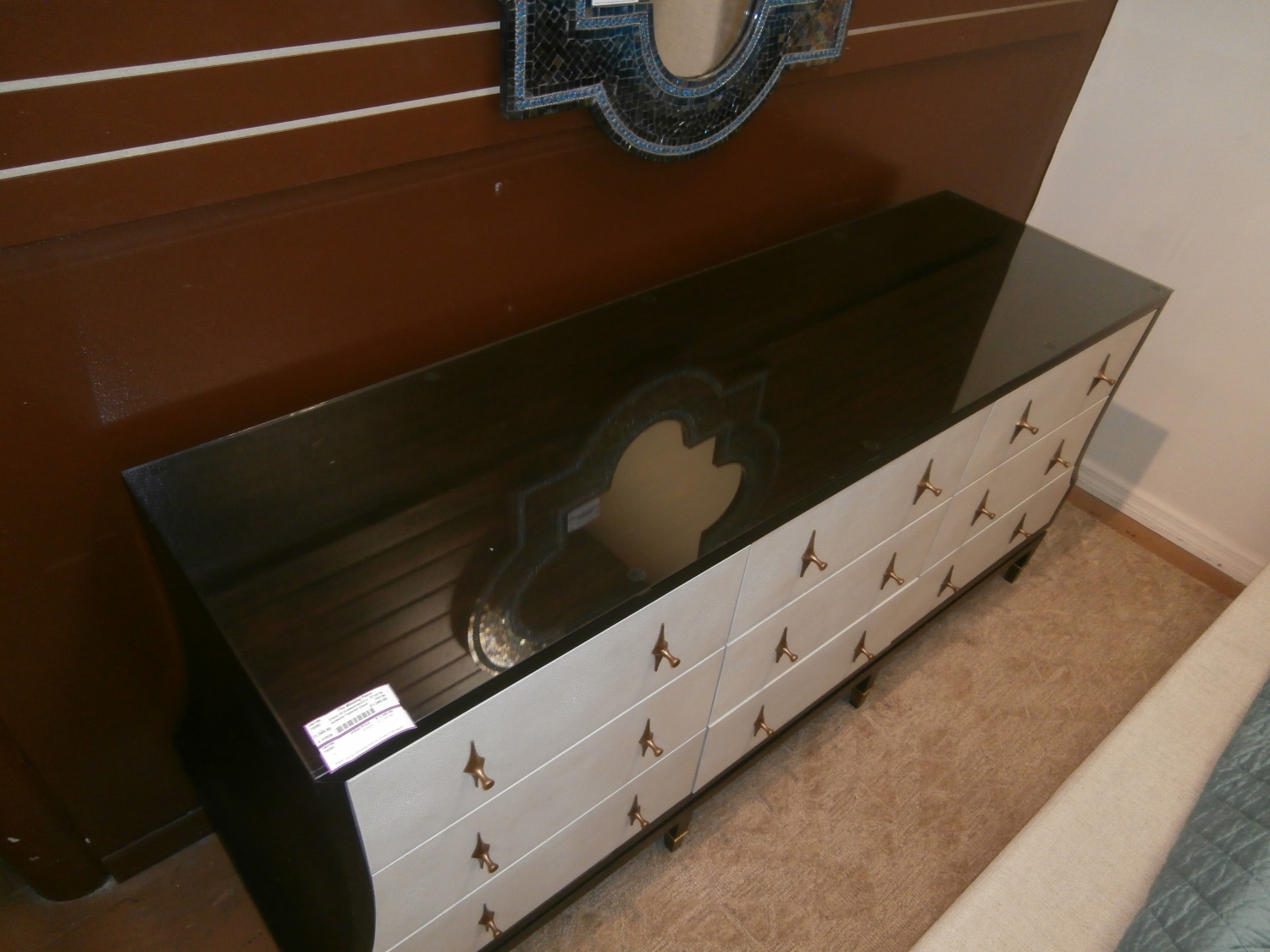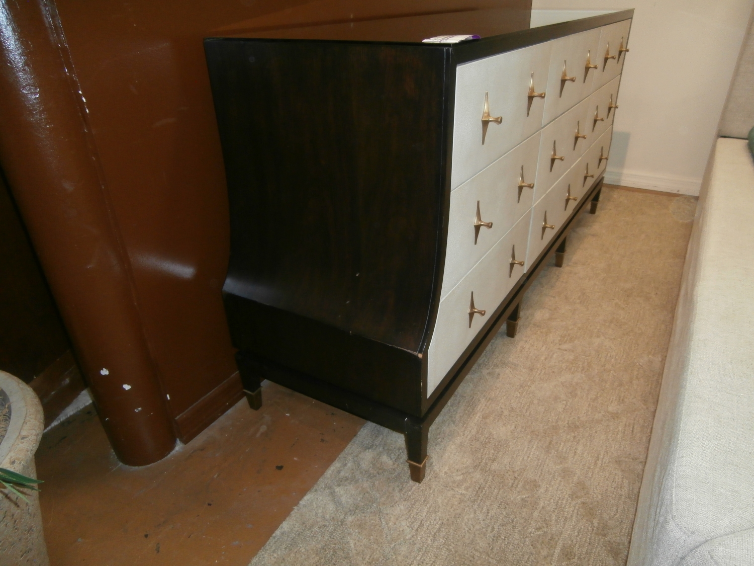 Stylish chest is made of solid mahogany and walnut veneer with a walnut color finish. Features faux Shagreen wrapped drawers and chic natural finish solid brass pulls with diamond shaped back plates and brass feet. 72*20*35