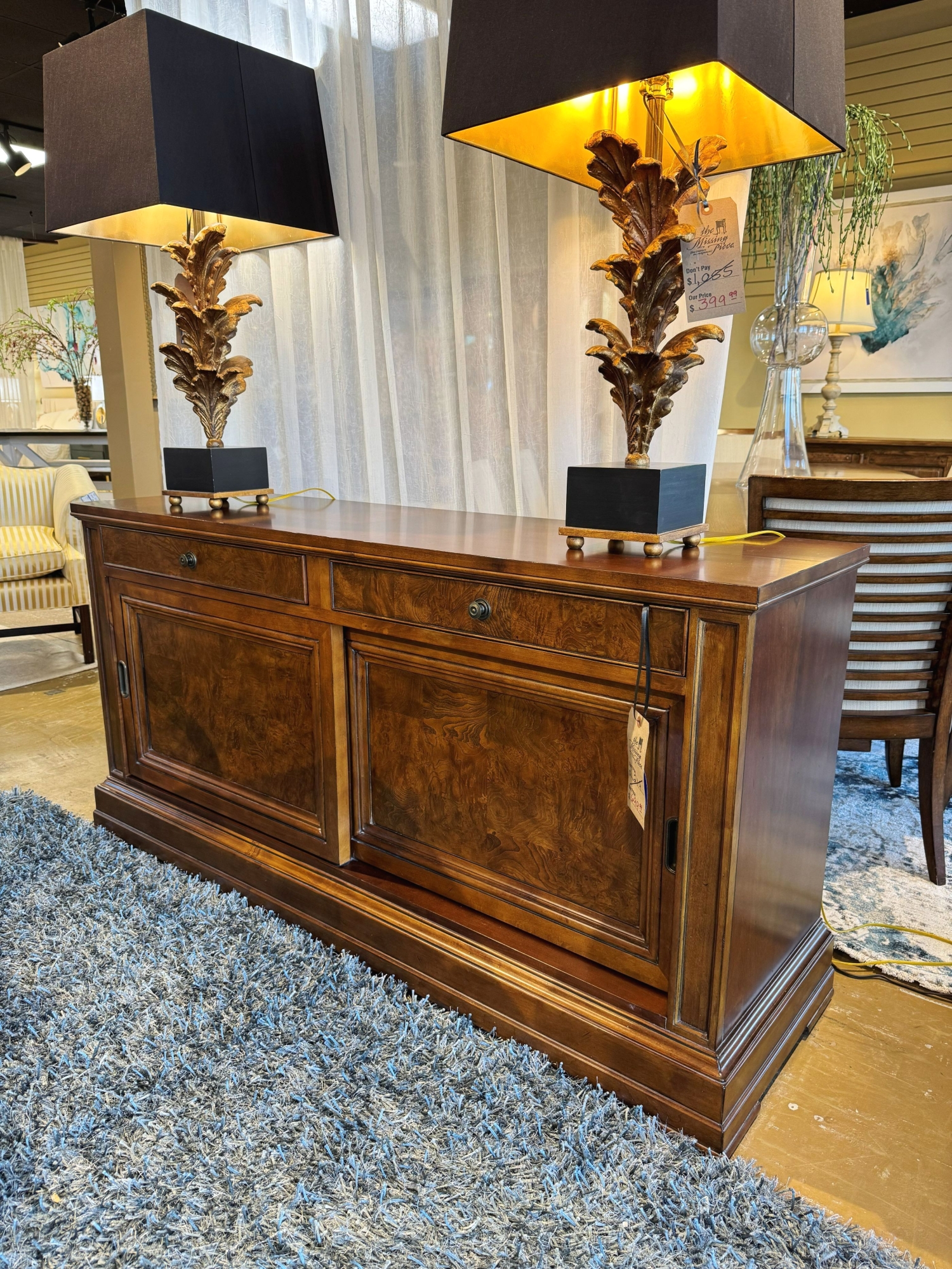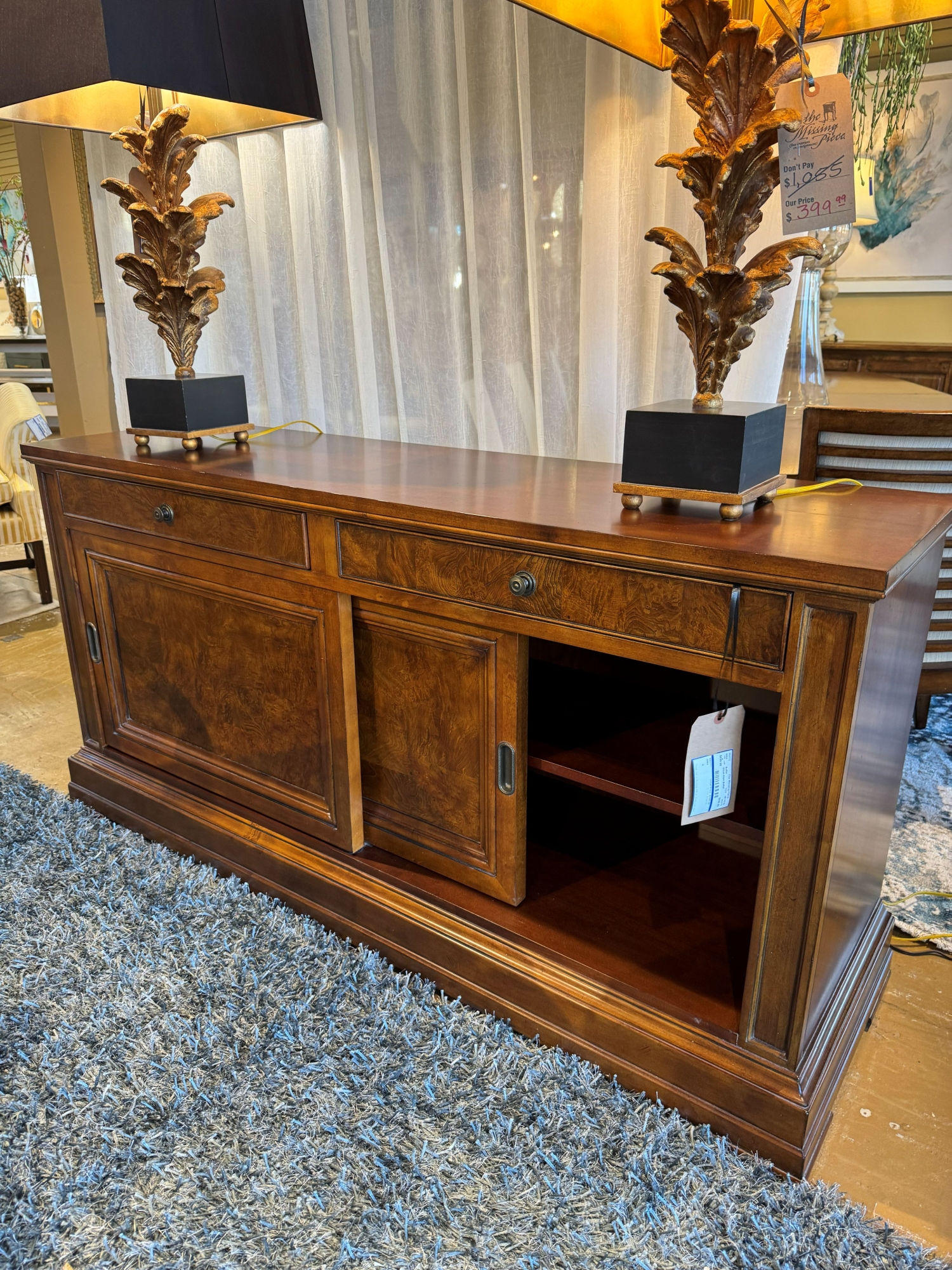 Ethan Allen traditional style buffet in a dark finish. There are two drawers with a shelf behind each sliding door. 65"long x 19"deep x 33"high. At posting, we have the matching dining set.
