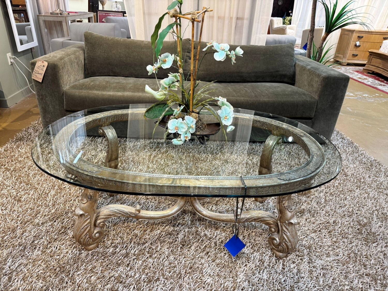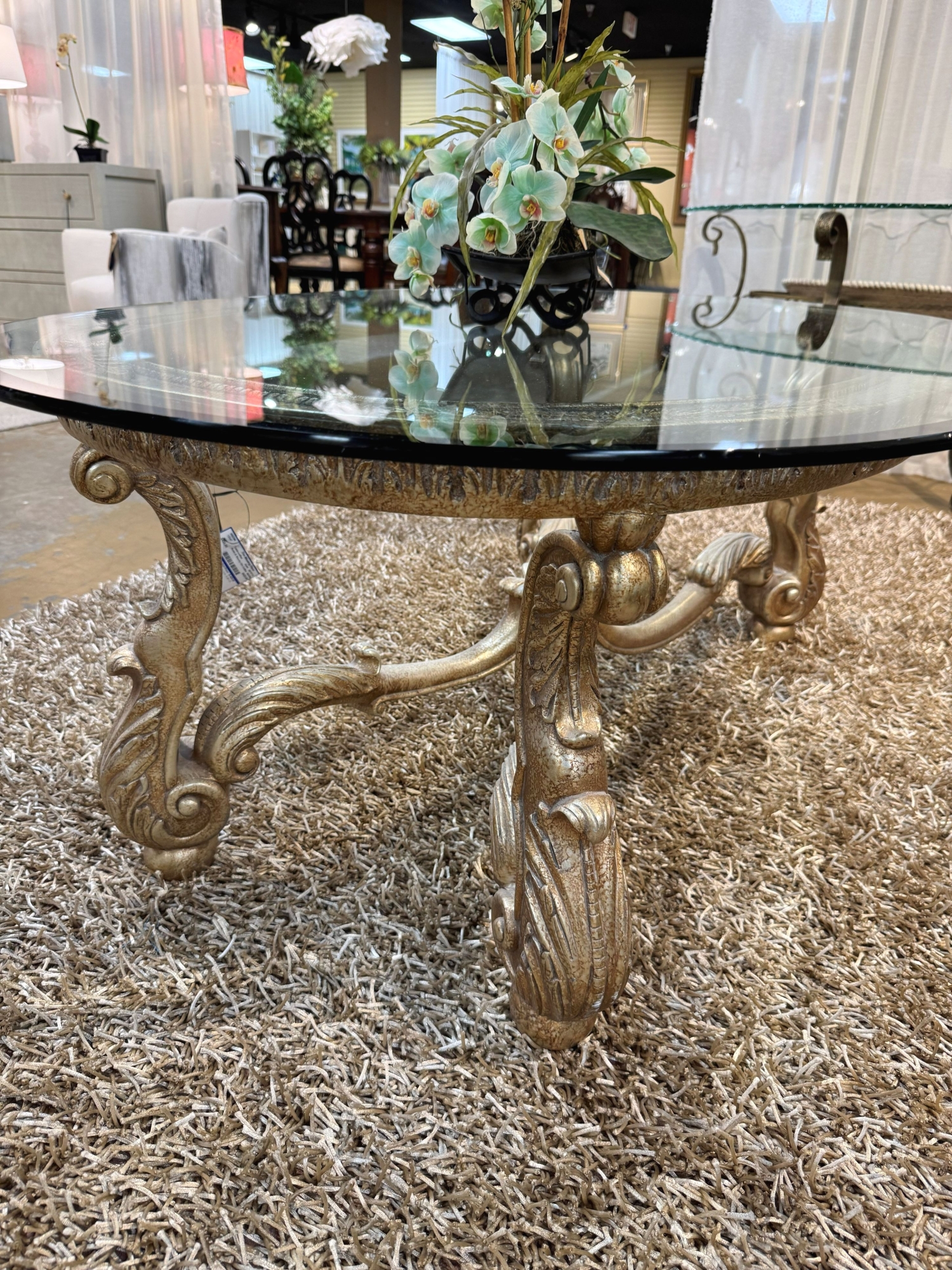 Robb & Stucky traditional style glass top coffee table on ornate brushed gold metal base. Beautiful! 55"long x 37"wide x 21"high.