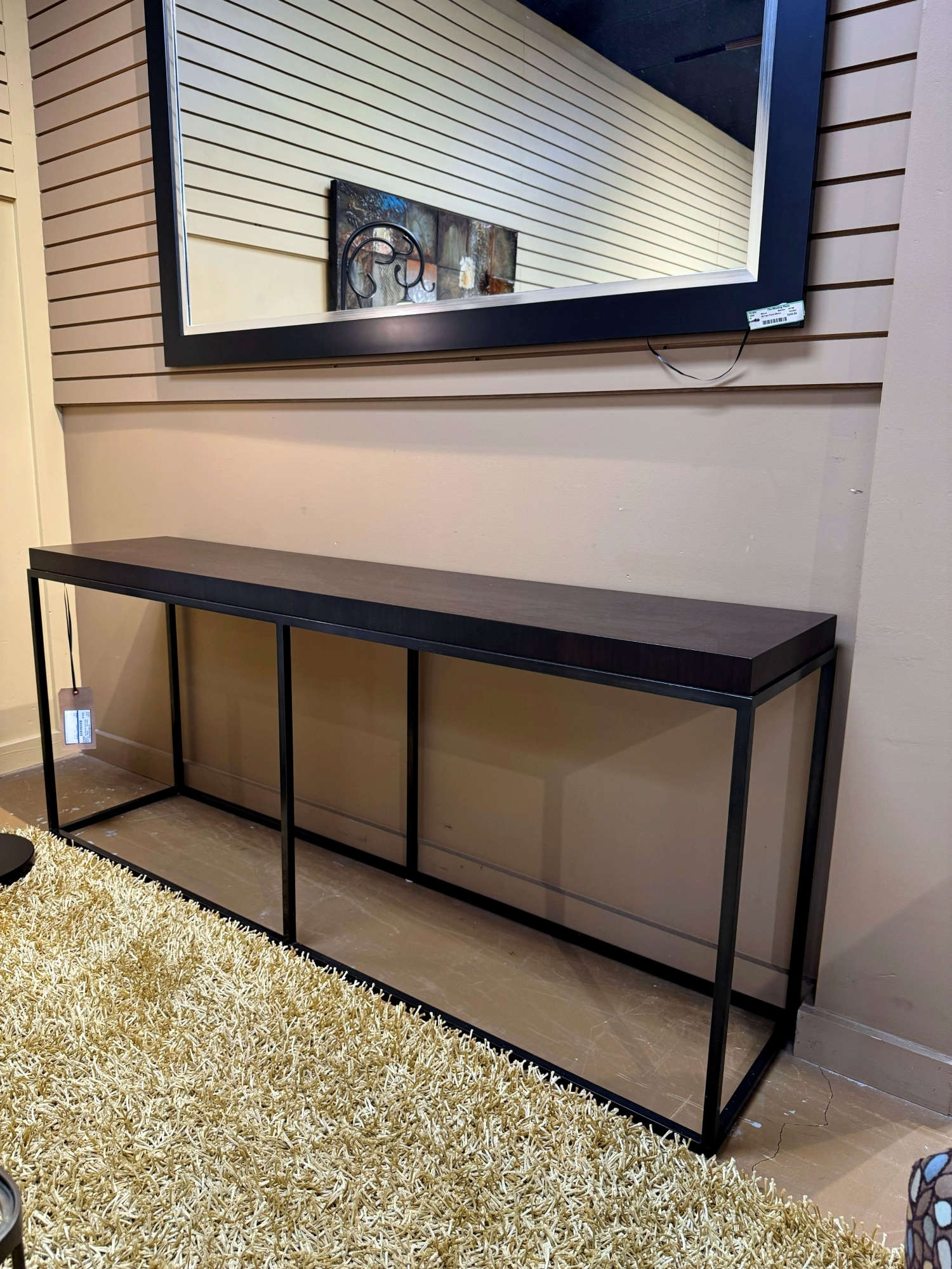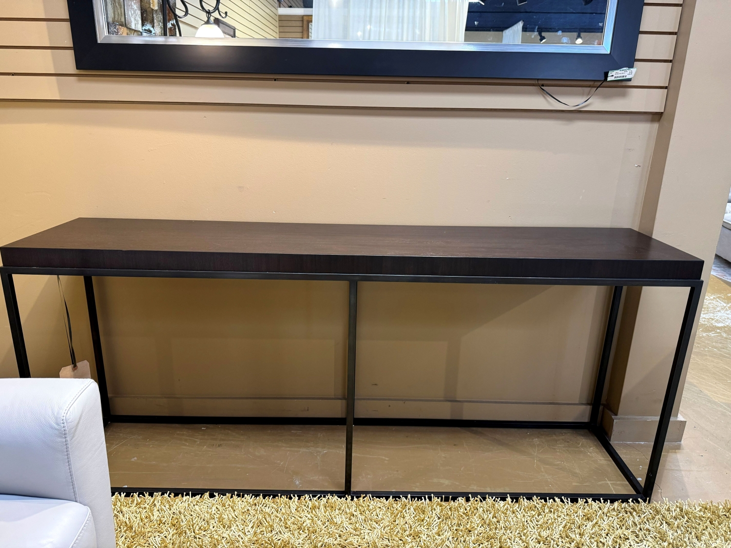 Restoration Hardware Nicholas console table in dark oak on metal legs. Inspired by 1960s French design, this table by Anthony Cox combines the warm texture of wood with a minimalist sculptural form. 72*16*30.