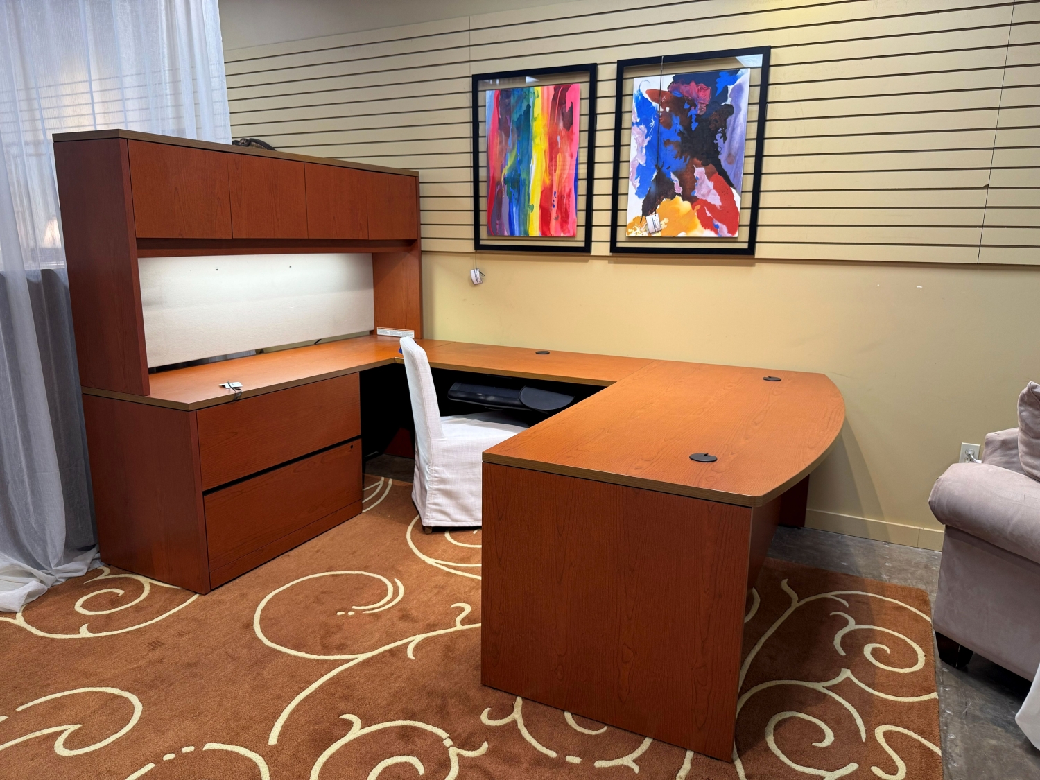 HON three piece desk unit with hutch in a medium finish. There are two drawers with three filing drawers. 107"long a 72"deep on either side x 67"high.