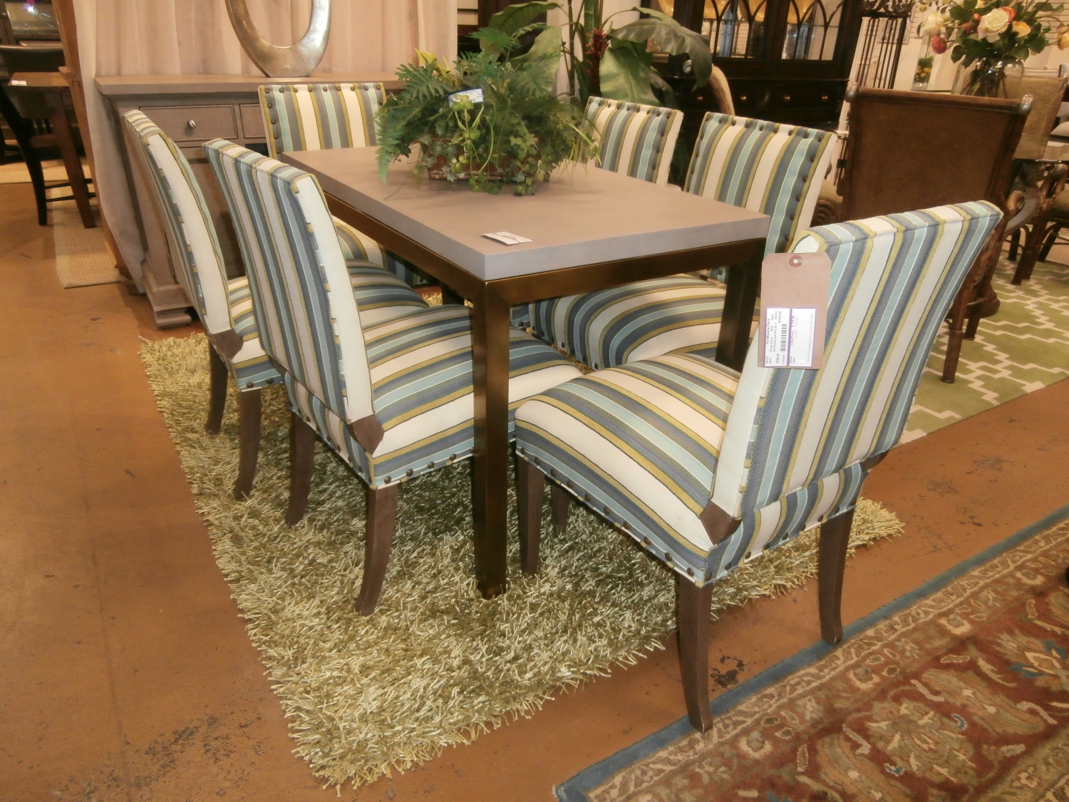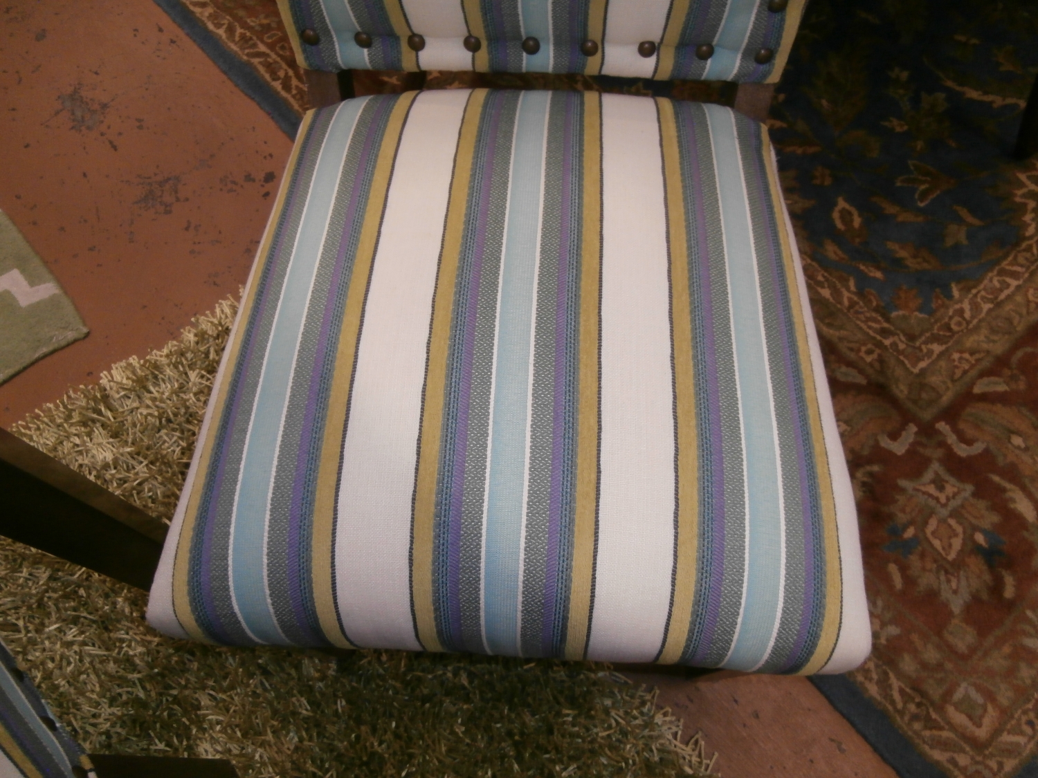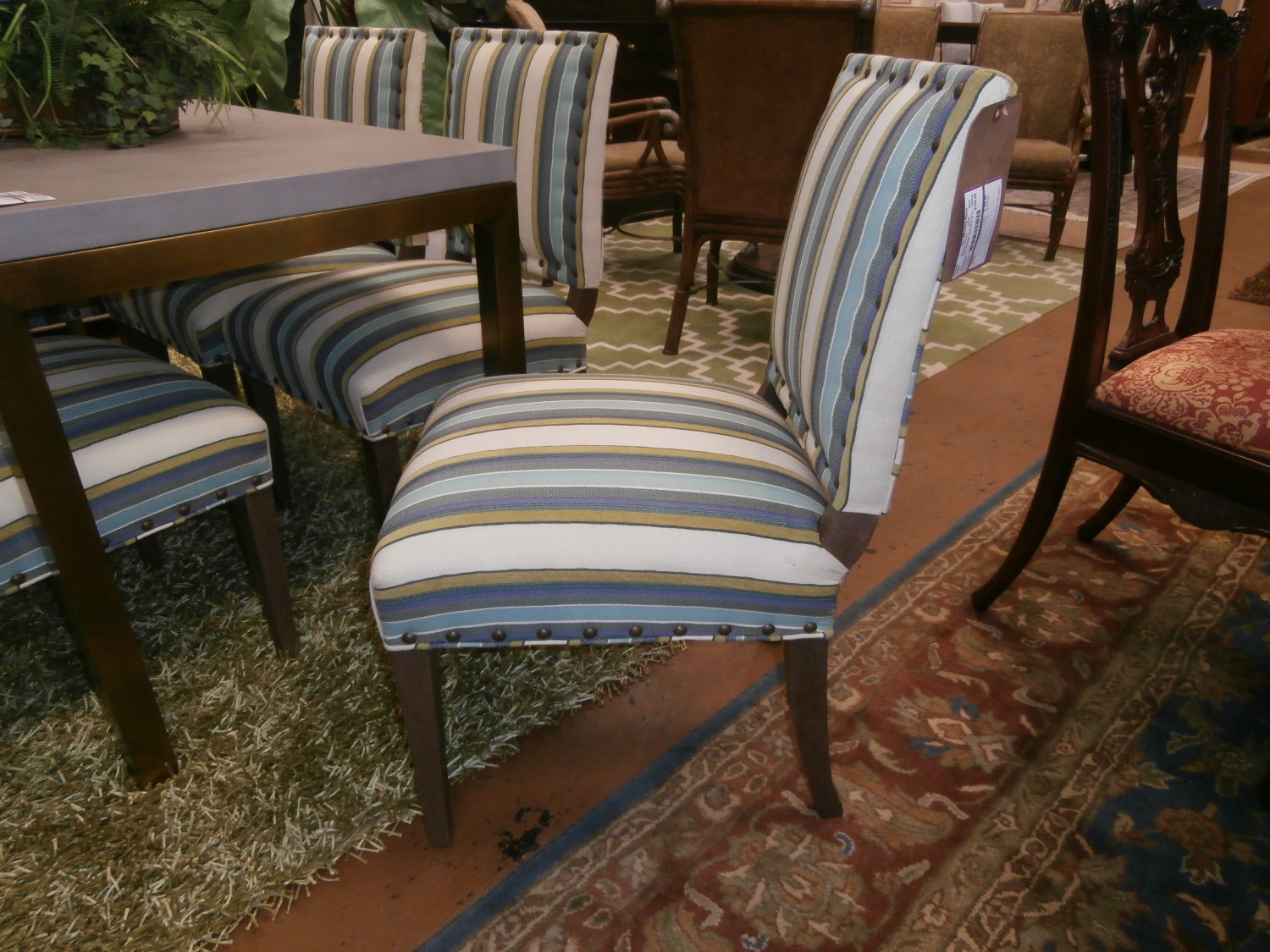Set of six upholstered Wesley Hall stripe dining chairs in multi colors.