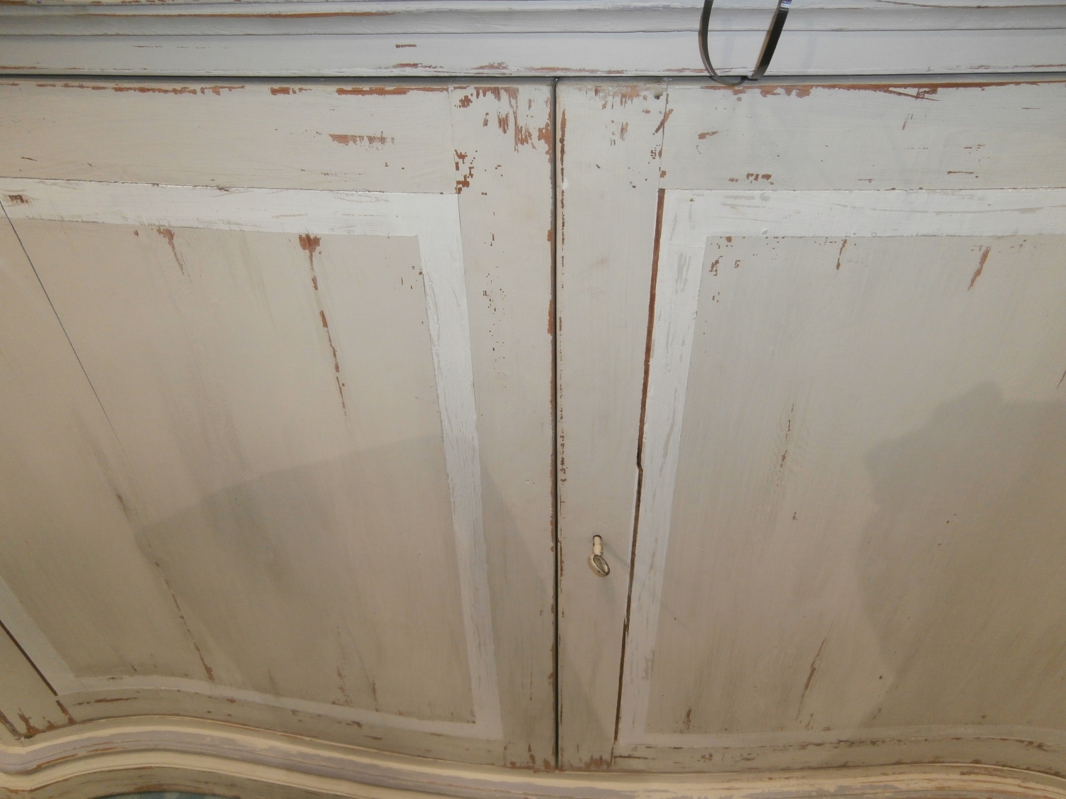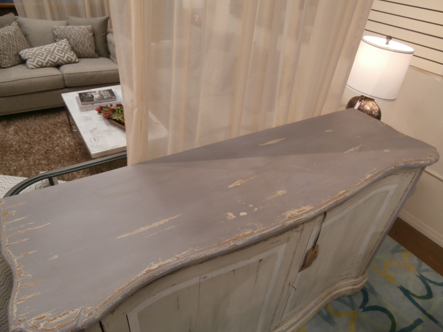 Lillian August nilson rustic two door cabinet with single shelf inside measuring 72"W,22"D,42"H in grey and white.