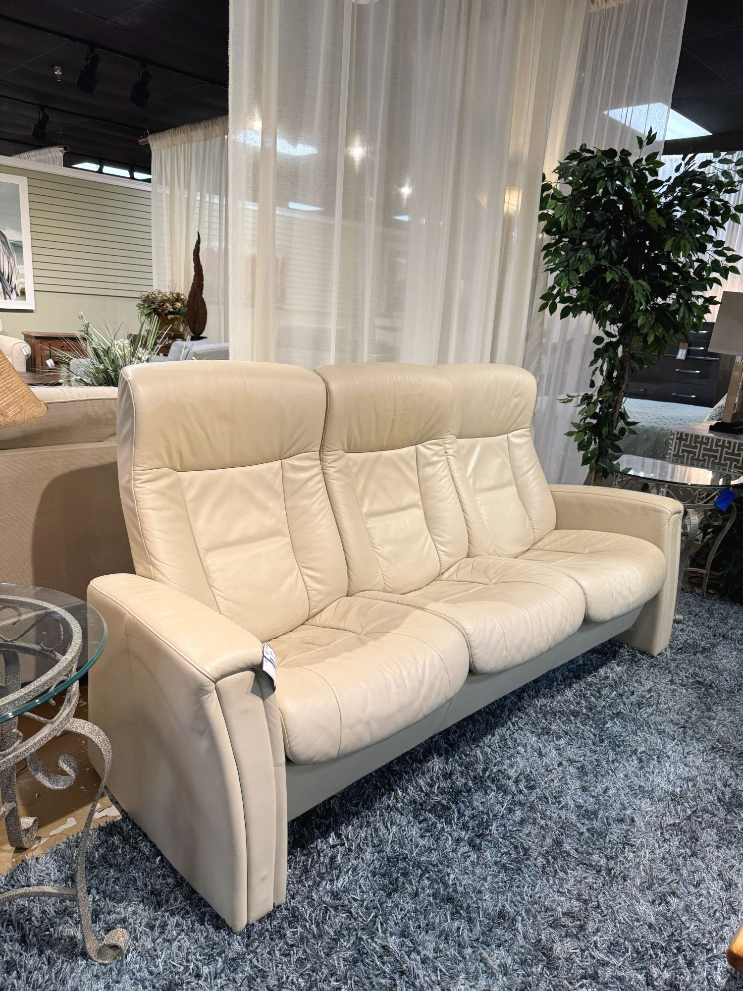 Fjords contemporary style three seat sofa in a cream leather. Pushback for slight recline in the seats. Ultra comfortable. 82"long x 33"deep x 40"high.