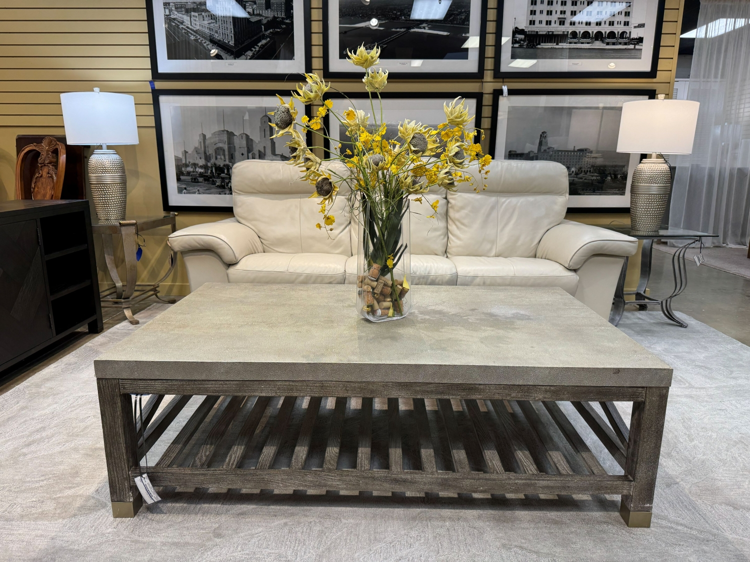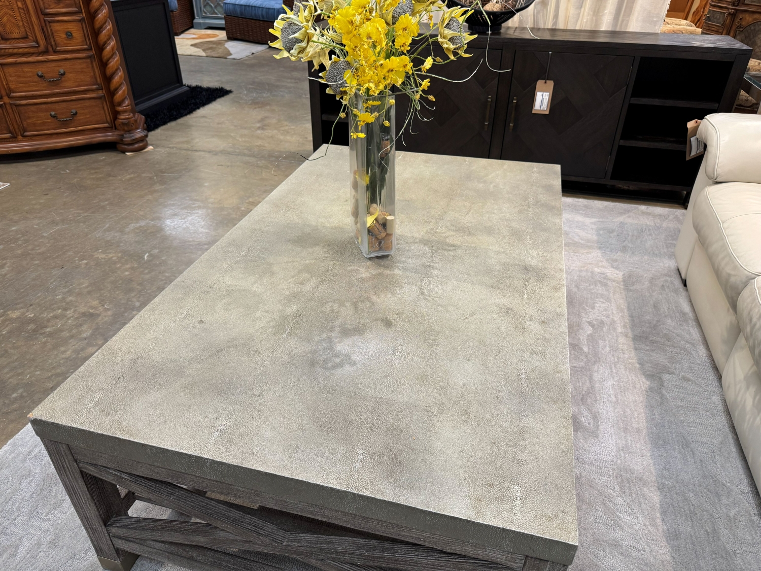 Restoration Hardware rustic coffee table on weathered gray wood frame with distressed shagreen embossed leather top. There is one slat shelf below. 59"long x 36"wide x 19"high.
