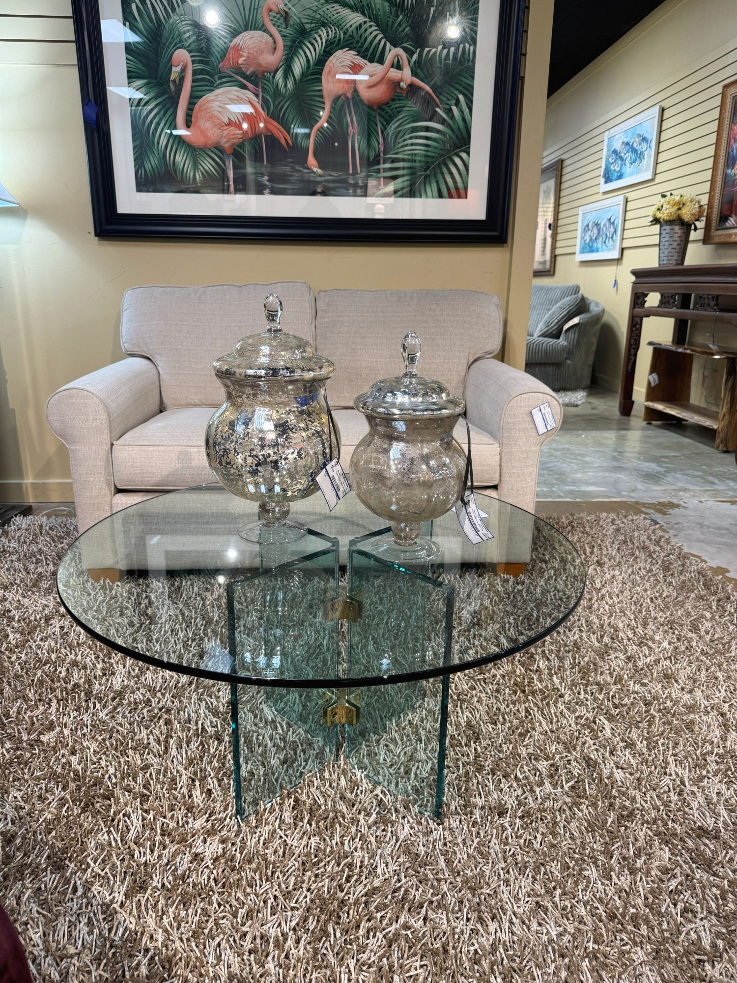 Contemporary style glass coffee table on matching glass pedestal base. Measures 36"round x 18"high.