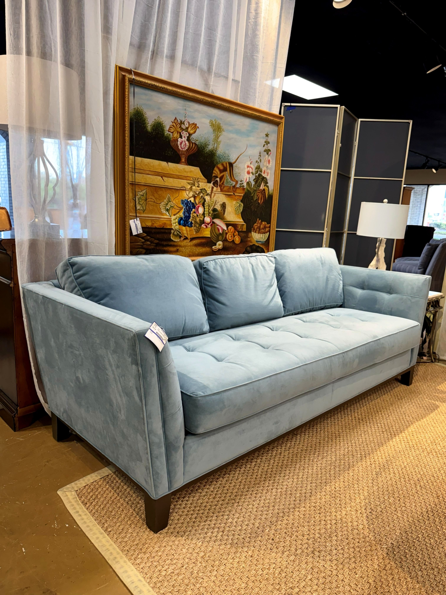 Cindy Crawford Park Boulevard transitional style tufted single cushion sofa in a plush sky blue upholstery on dark feet. Comes with two blue & white patterned accent pillows. 93"L x 38"D x 34"H.