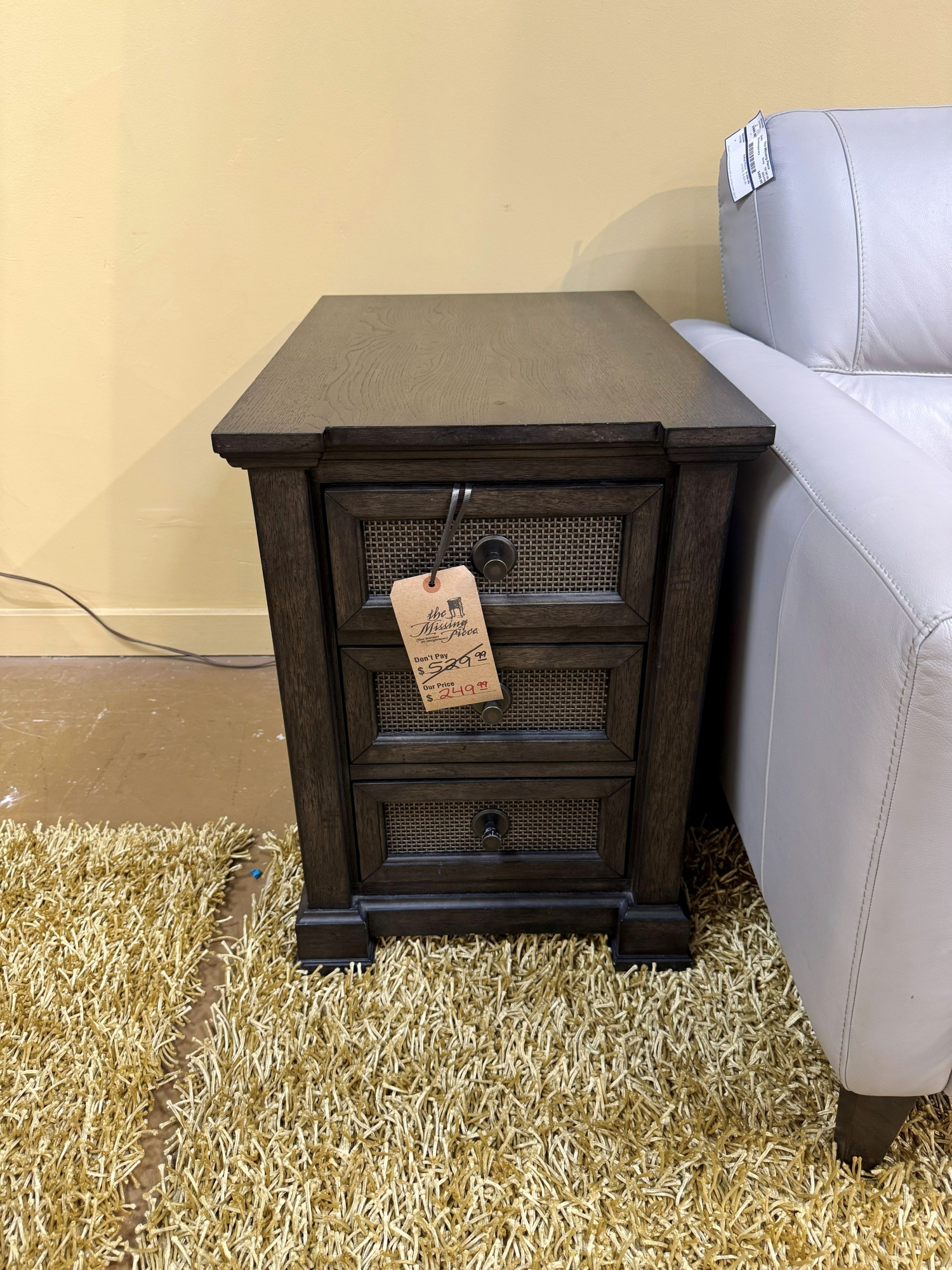 Havertys Aberdeen end table in a rustic dark finish. There are three drawers. 18"wide x 27"deep x 25"high. At posting, we have two & the matching console.