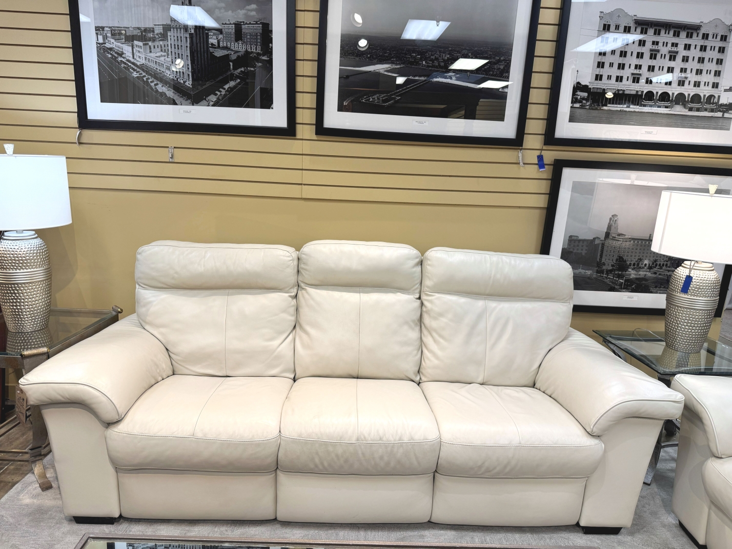 Palliser Alaska dual power reclining sofa in a white leather. Both the headrest and footrest adjust. Comfortable deep plush seats with well cushioned arms. At posting, we have three! 95"L x 42"D x 39"H.