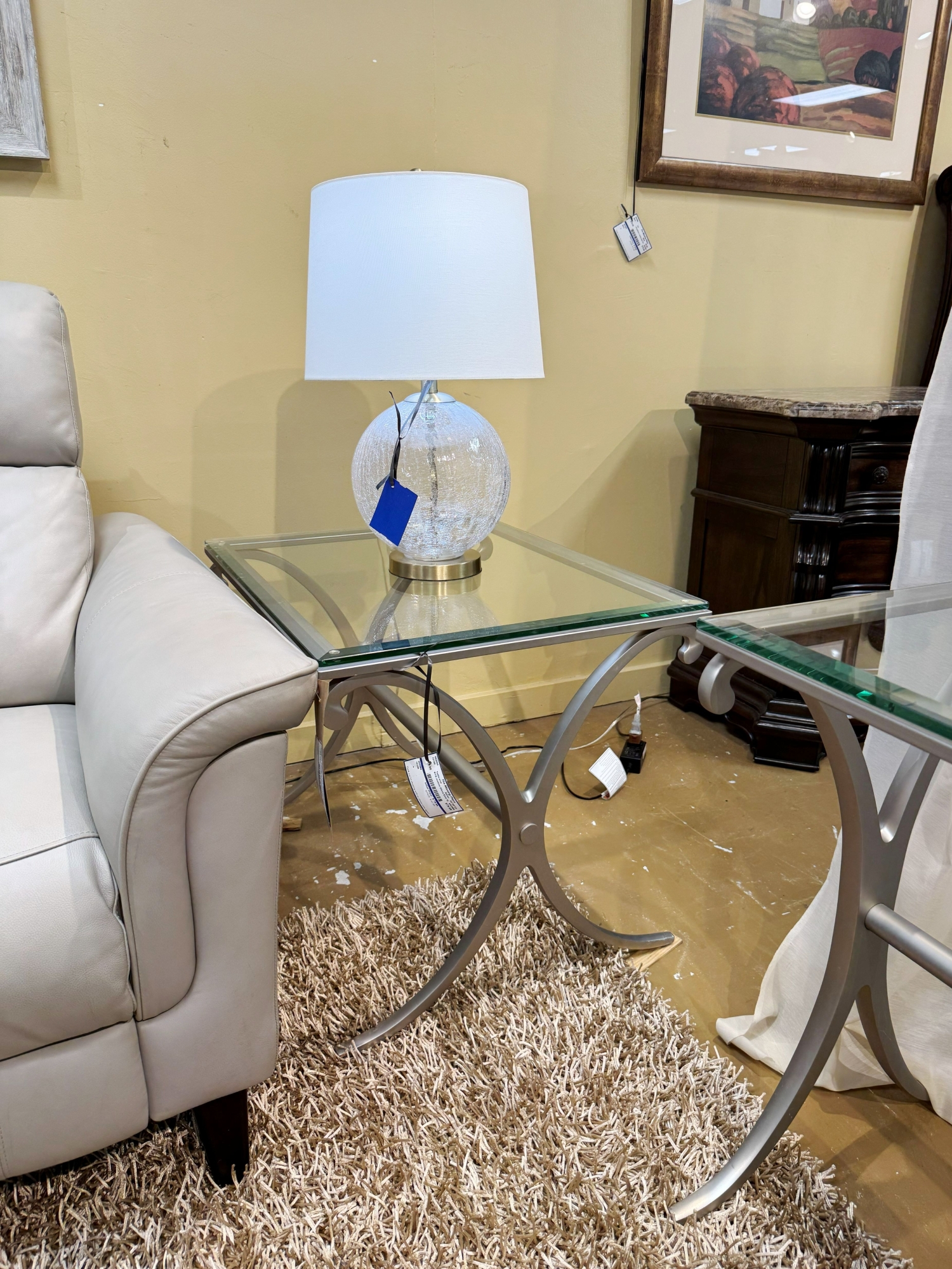Rooms To Go Justine glass end table on silver metal legs. Nice, contemporary style. 23"wide x 28"deep x 23"high. At posting, we have two & the matching coffee table.