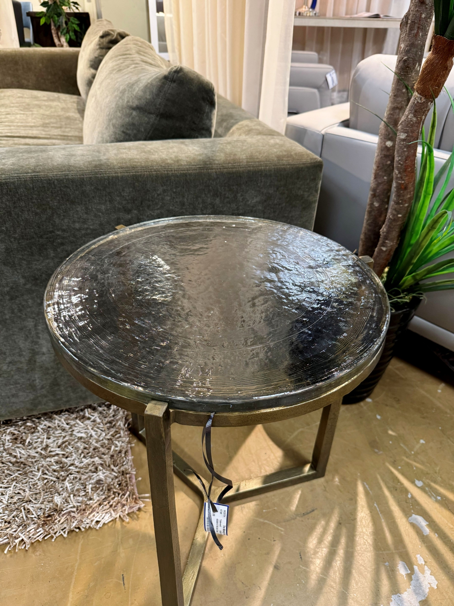 Palmdale contemporary style end table with thick textured glass top on gold metal legs. Measures 19"round x 23"high. At posting, we have four.
