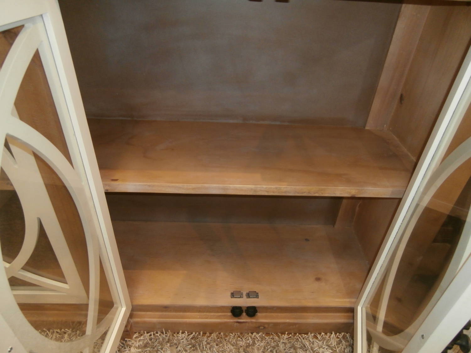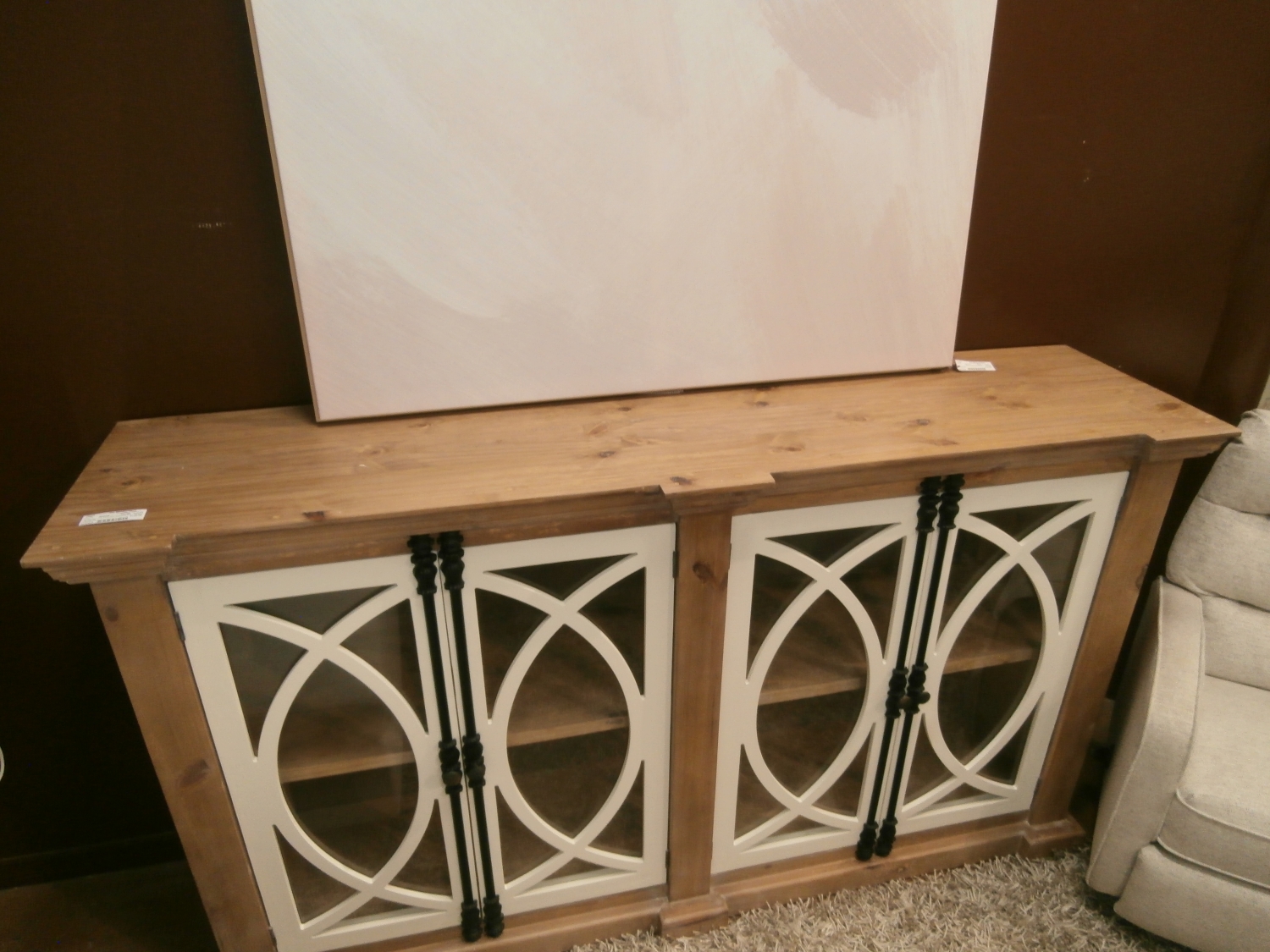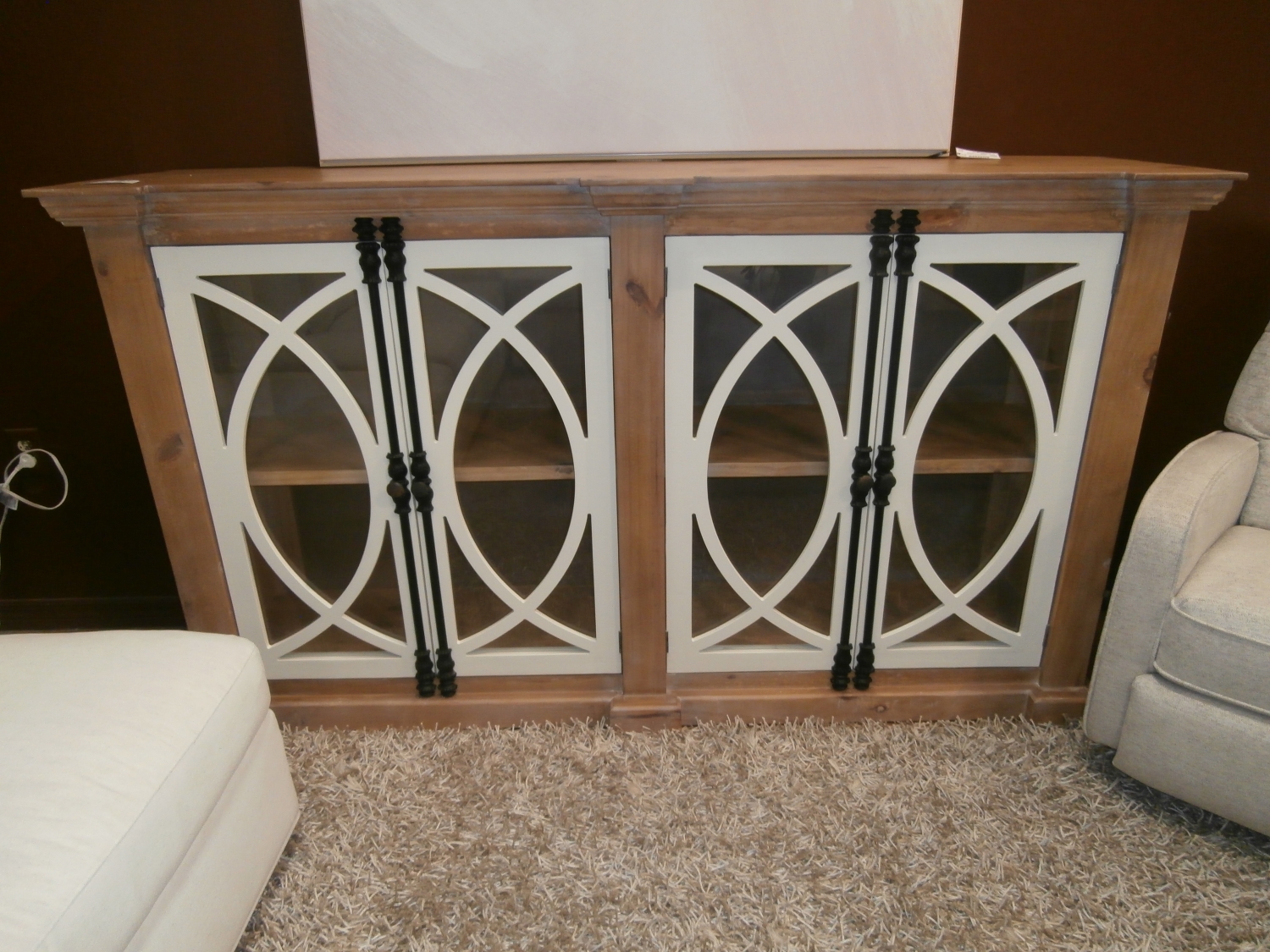 Stuning Pescara four door glass pane cabinet in a light weathered finish with contrasting white door fronts & black metal French casement hardware. Inside shelf goes across middle for more display. Measures 76"W,19"D,44"H.