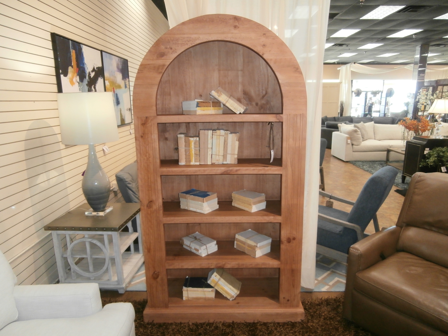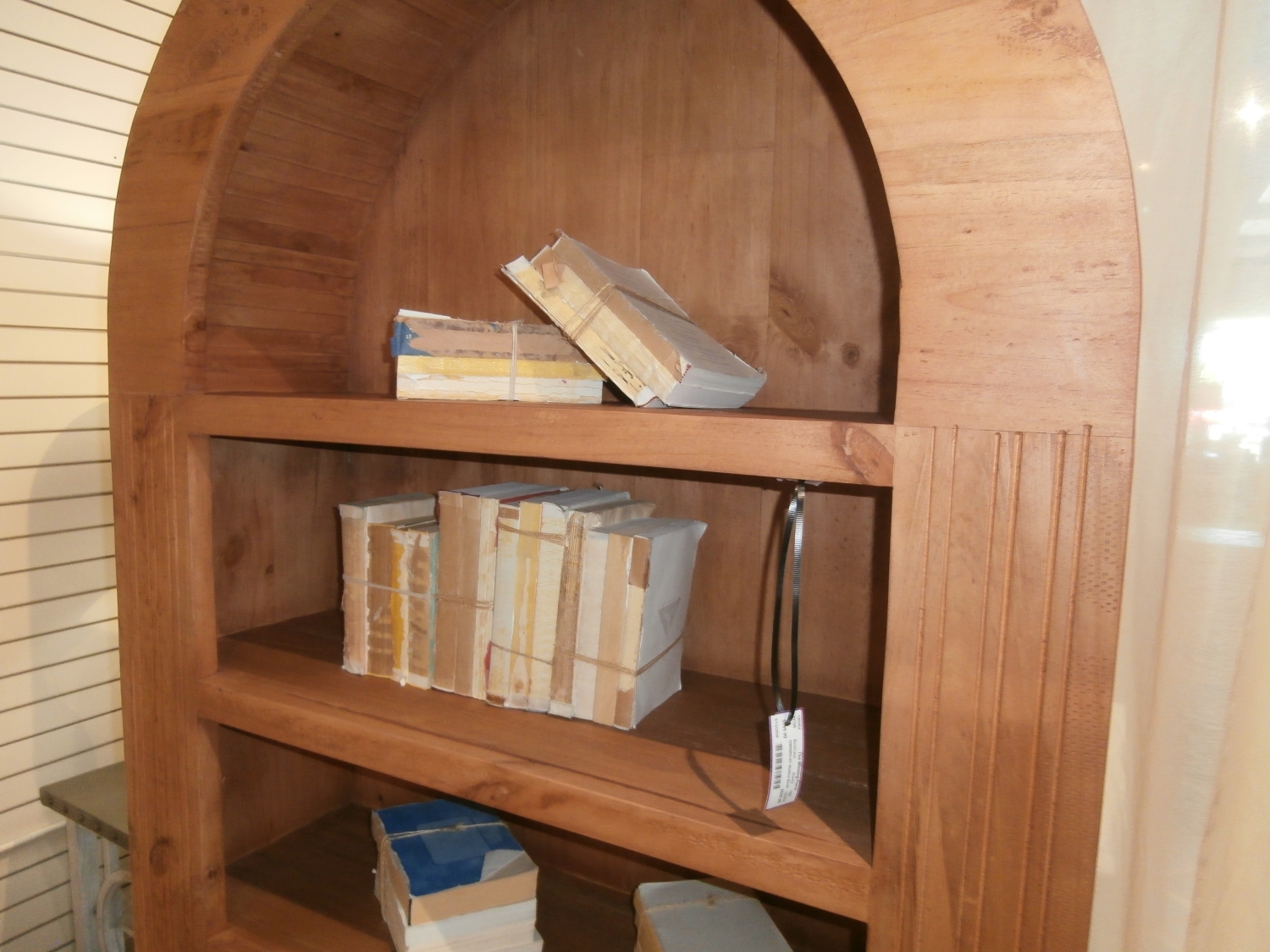 Medina rustic arched wood bookcase in a warm honey finish. There are four shelves. Measures 46"W,16"D,82.