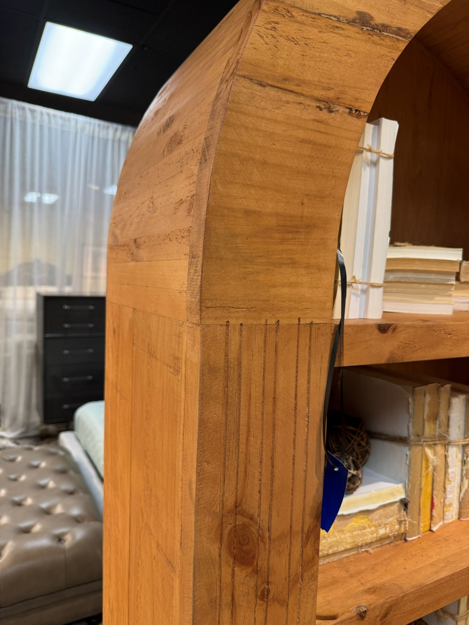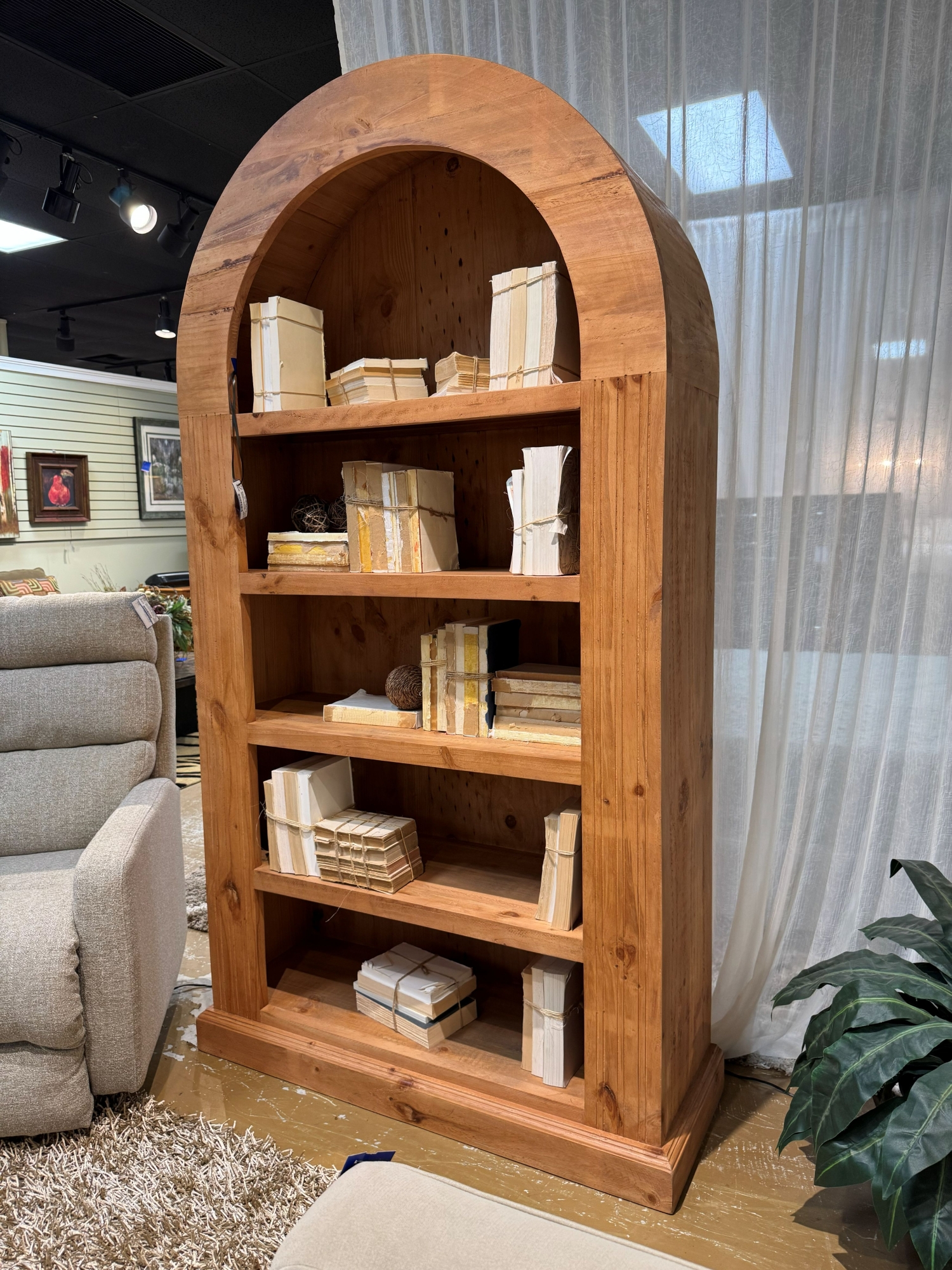 Medina rustic arched wood bookcase in a warm honey finish. There are four shelves. 46"wide x 16"deep x 82"high.