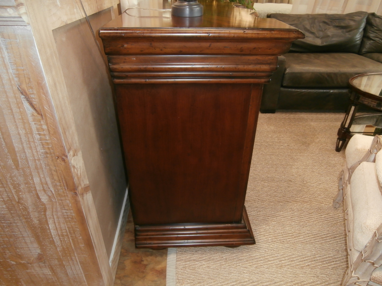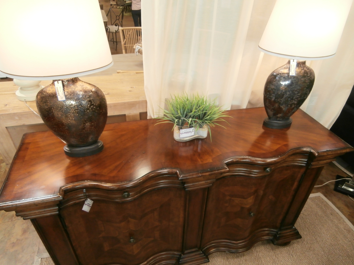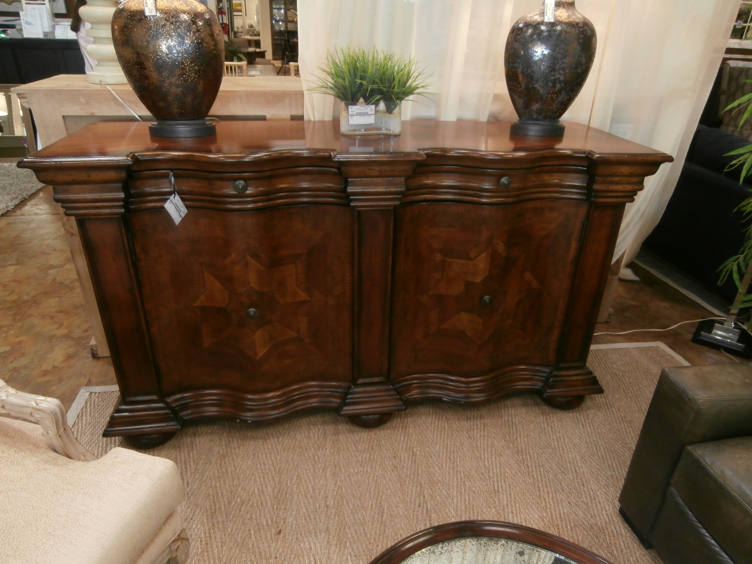 A stunning buffet from Hooker that comes in a pecan stain with elegant serpentine curves. 2 narrow drawers on the top can hold your serving ware, the cabinet doors have masterfully crafted inlay patterns. Measures 72*22*40H.