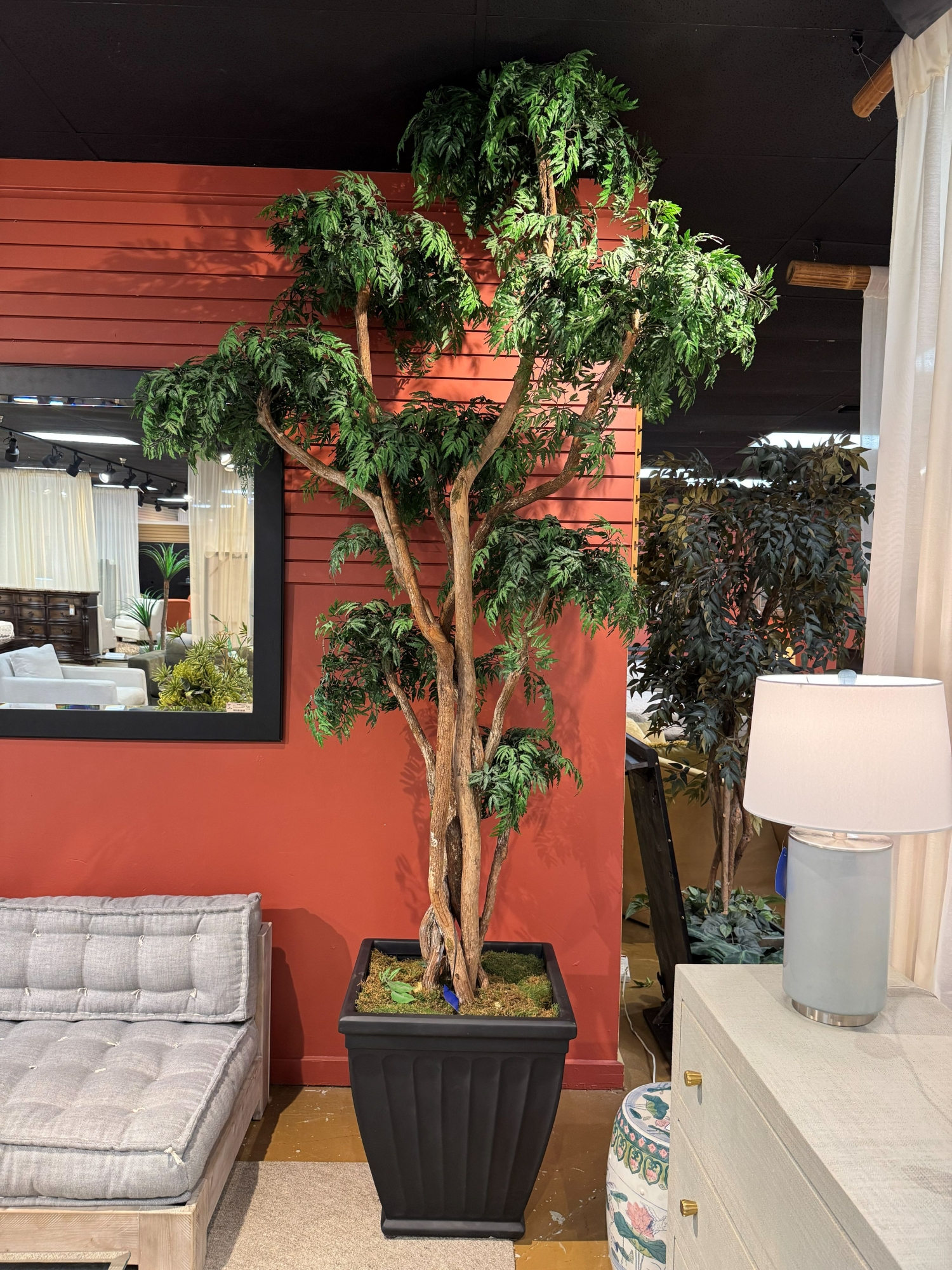 Large decorative Ming Aralia tree in ribbed black pot. 124"tall. Grand accent piece for your home.