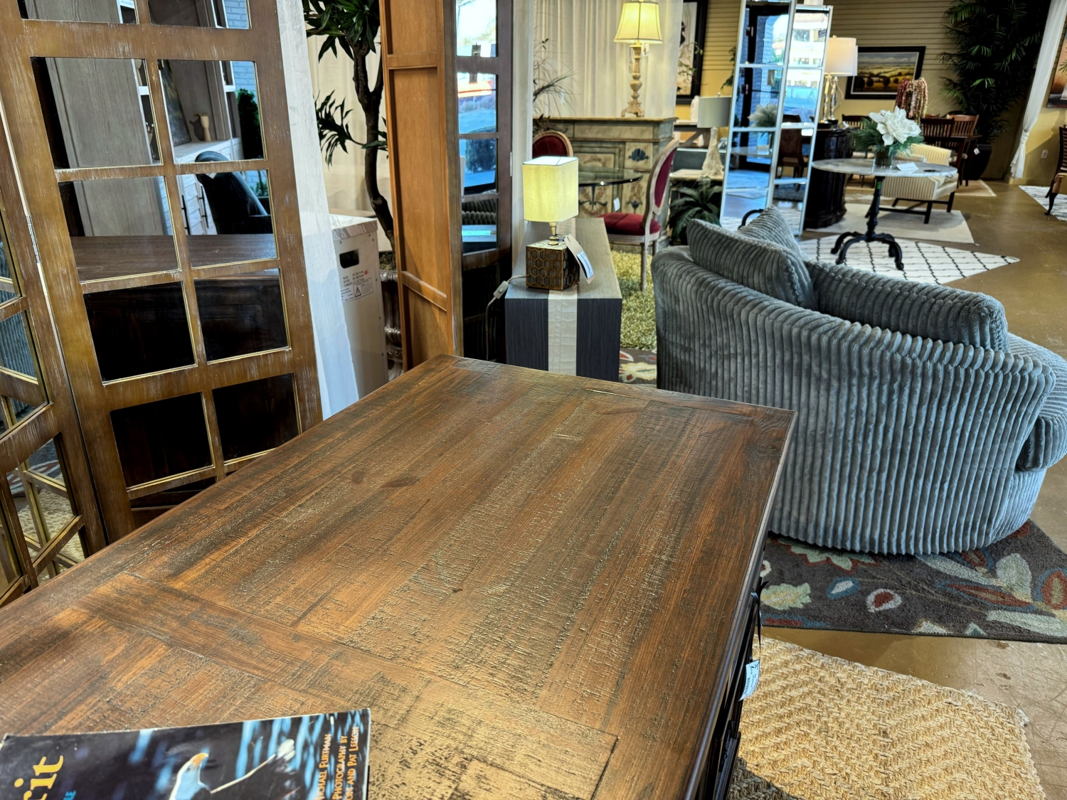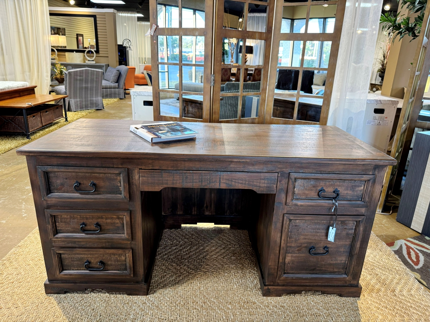 Rustic wood desk in a dark tobacco finish. There are five drawers with one filing drawer. Great find for your office. 68"long x 29"deep x 32"high.