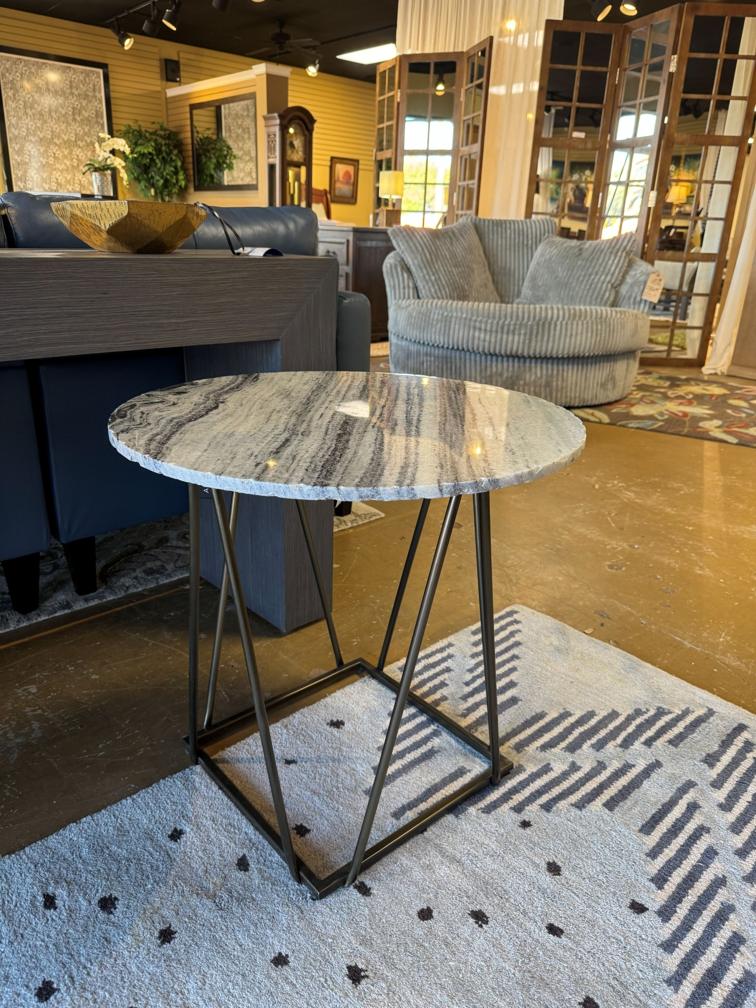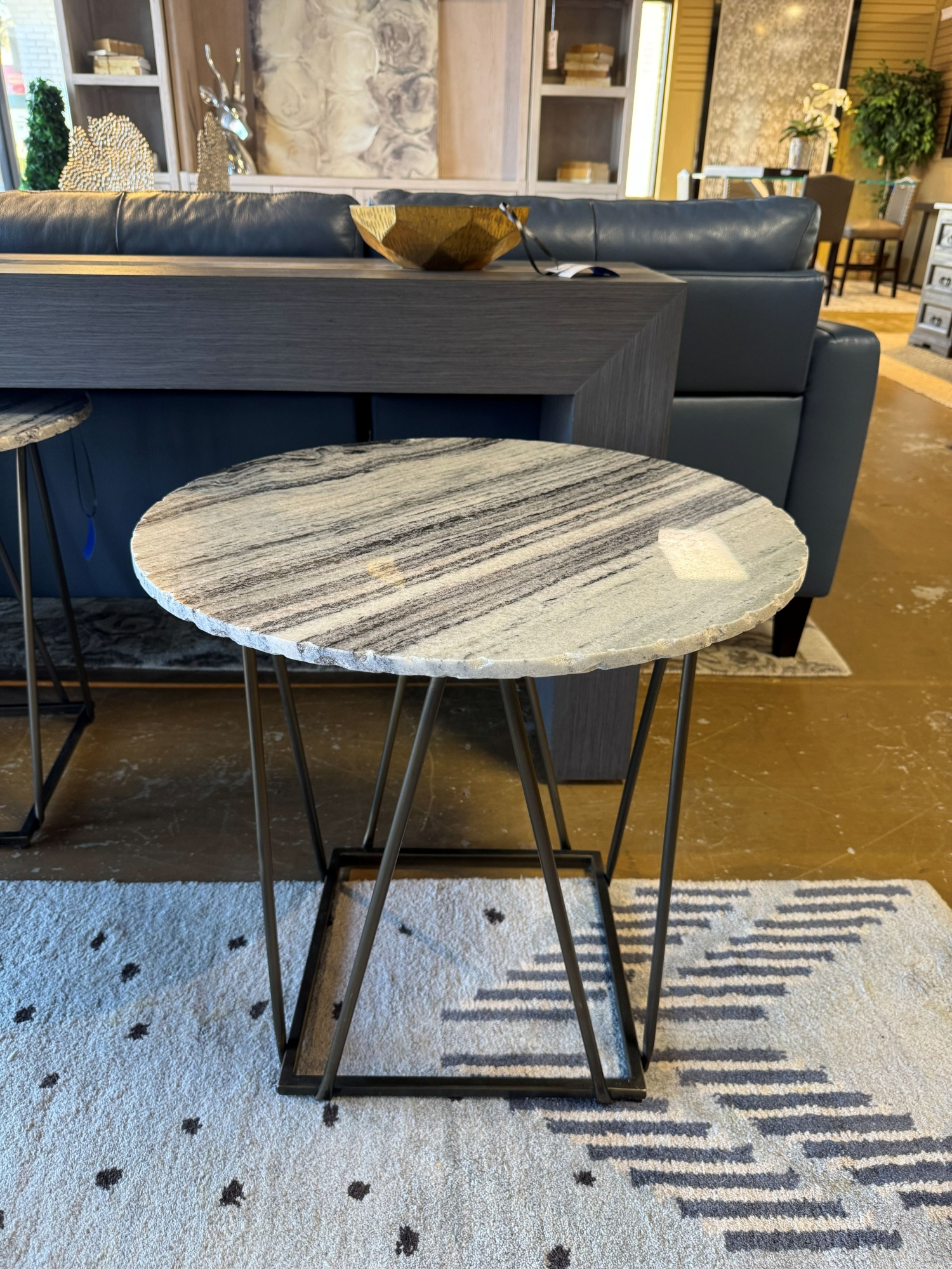 Irvine marble top end table in white & gray on bronze metal legs. Nice, transitional style. 24"round x 23"high. At posting, we have two & the matching coffee table.