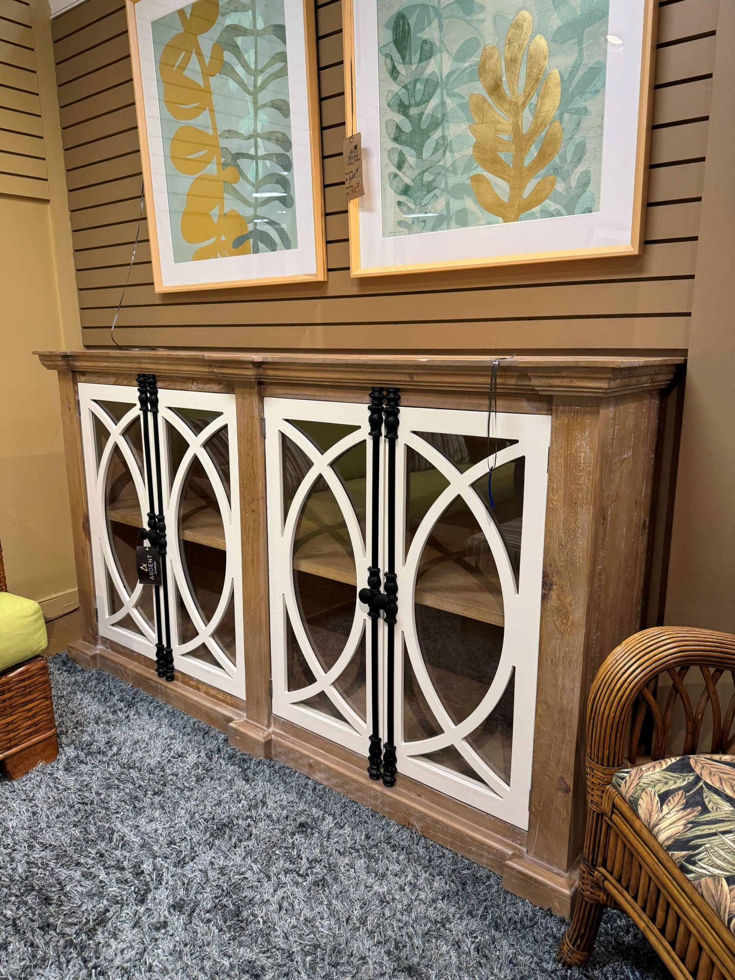 Pescara four door glass pane cabinet in a light weathered finish with contrasting white door fronts & black metal French casement hardware. This piece could be used in any room. 76"long x 19"deep x 44"high.