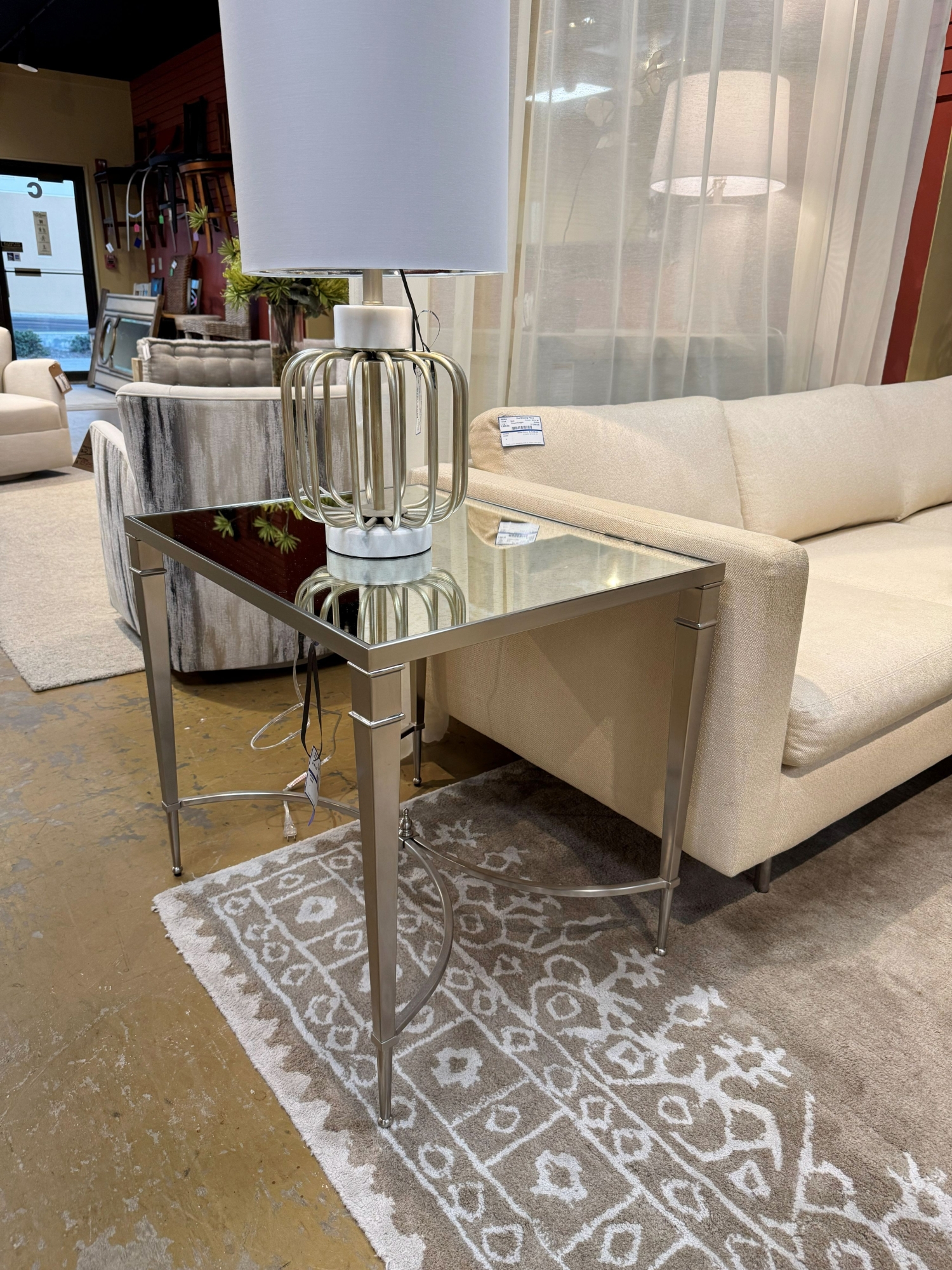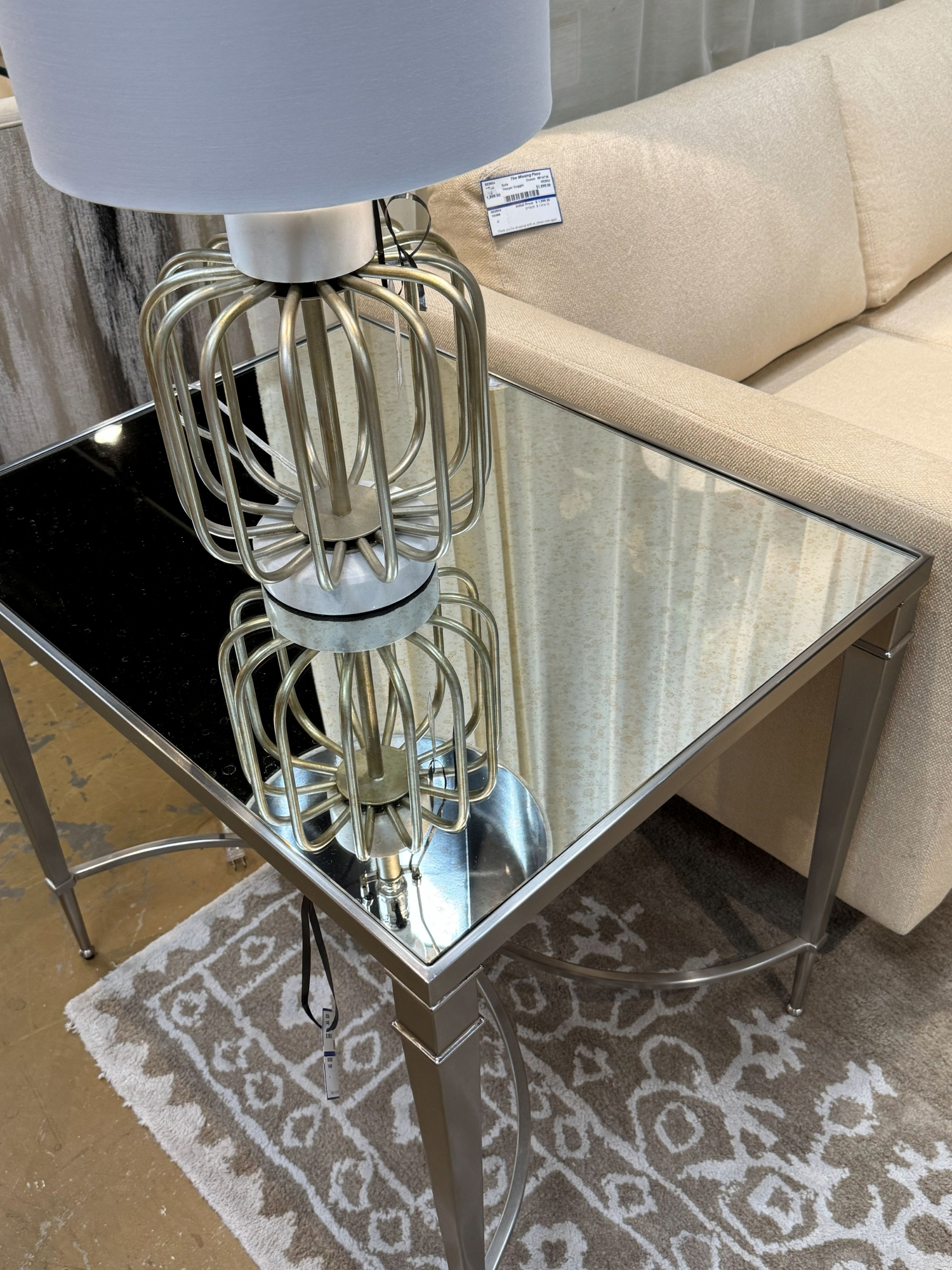 Hammary Mallory contemporary style end table with antiqued mirror top on silver metal legs. At posting, we have the matching coffee table. 28"long x 22"wide x 25"high.