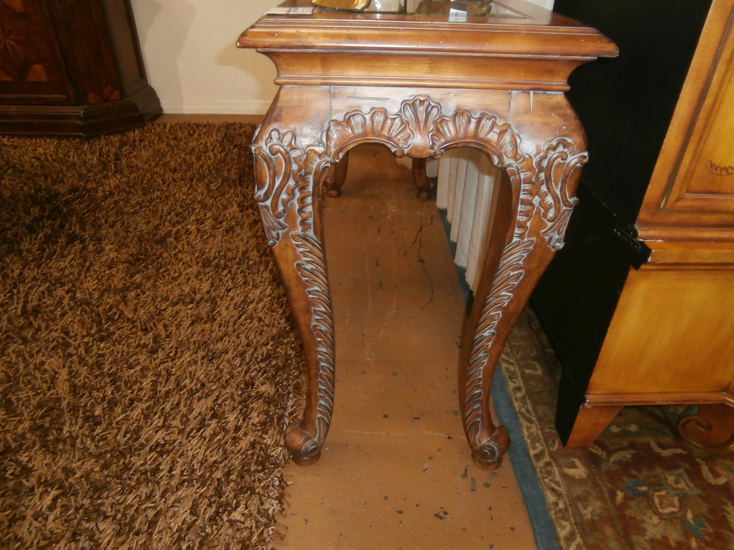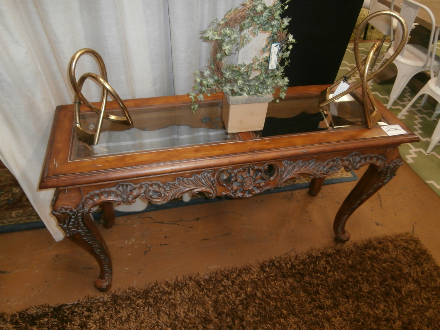 Wood carved console table with glass insert top. Measures 57"W,19"D,33"H in brown.
