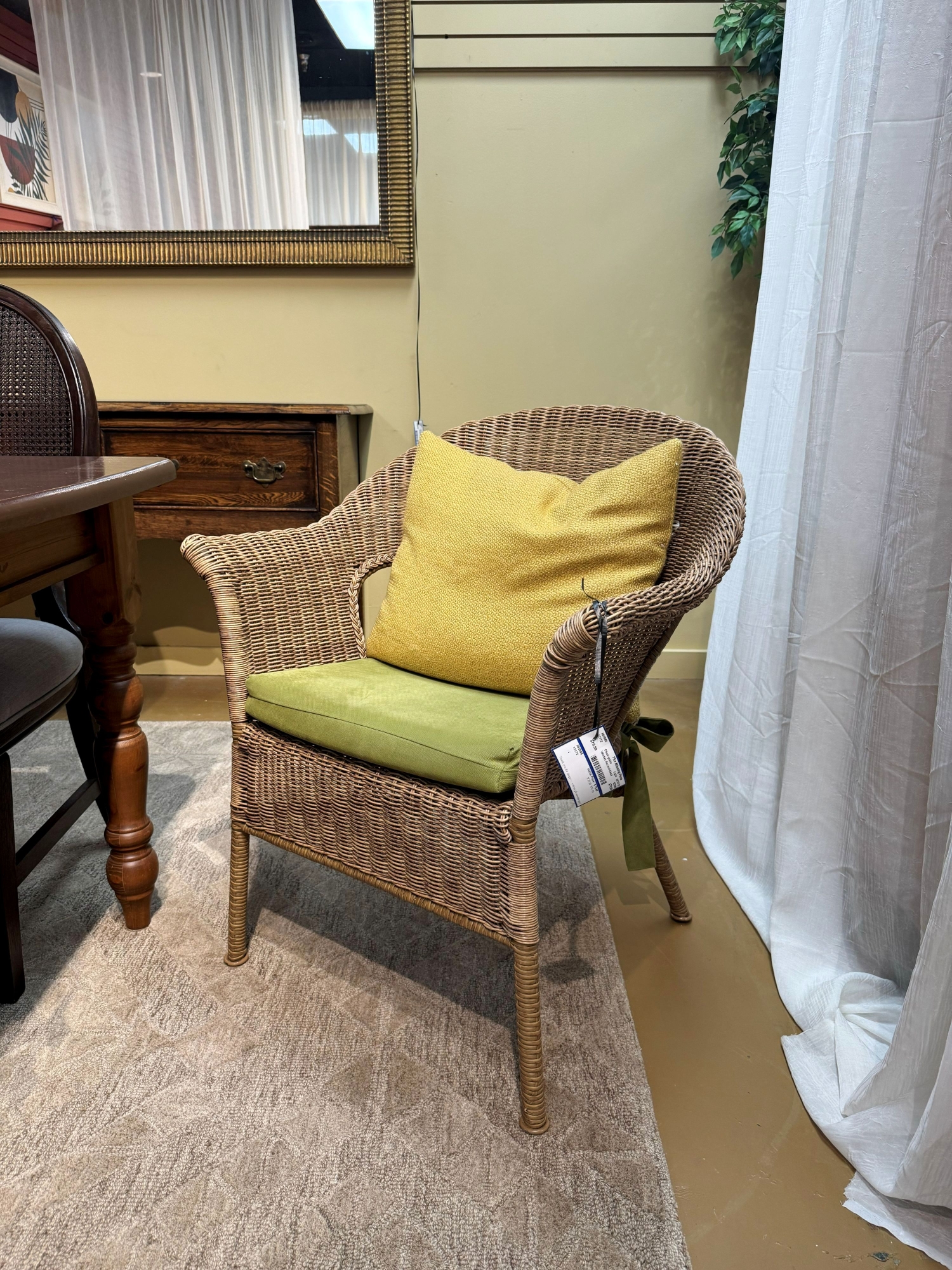 Petite wicker arm accent chair in a natural finish with green upholstered seat cushion. Comes with yellow accent pillow. At posting, we have two. 28"wide x 23"deep x 33"high.