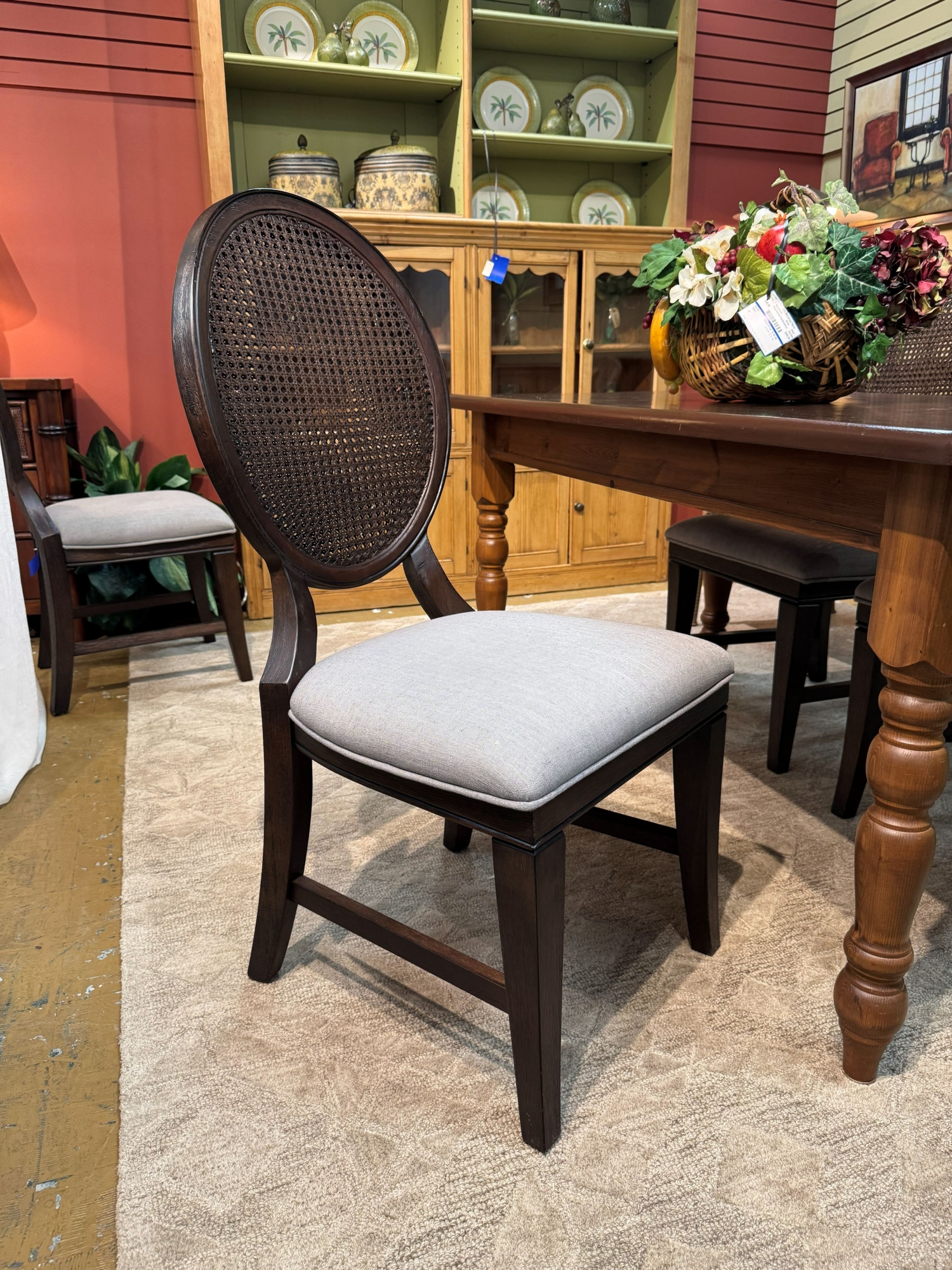 This is a set of four American Signature oval cane back dining chairs in a dark finish with gray upholstered seats. Each measures 20"wide x 21"deep x 42"high.
