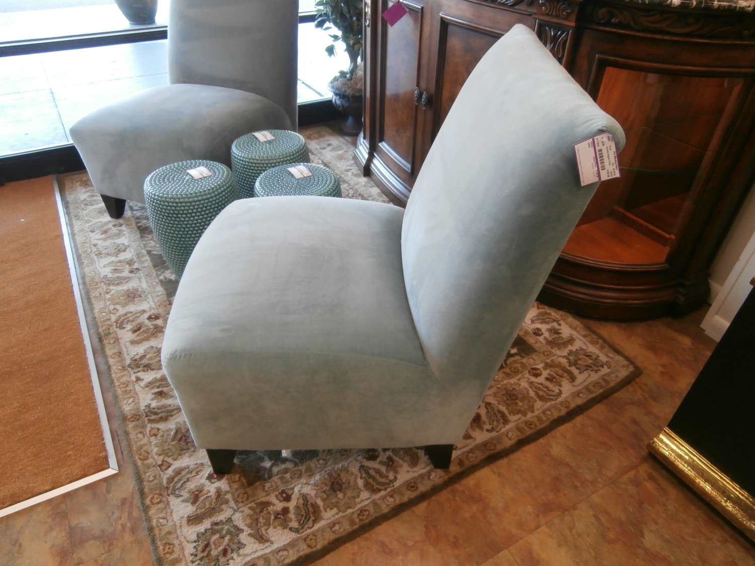 Velvety slipper chair measuring 28"W,35"D,39"H in a teal blue. Two at time of post.