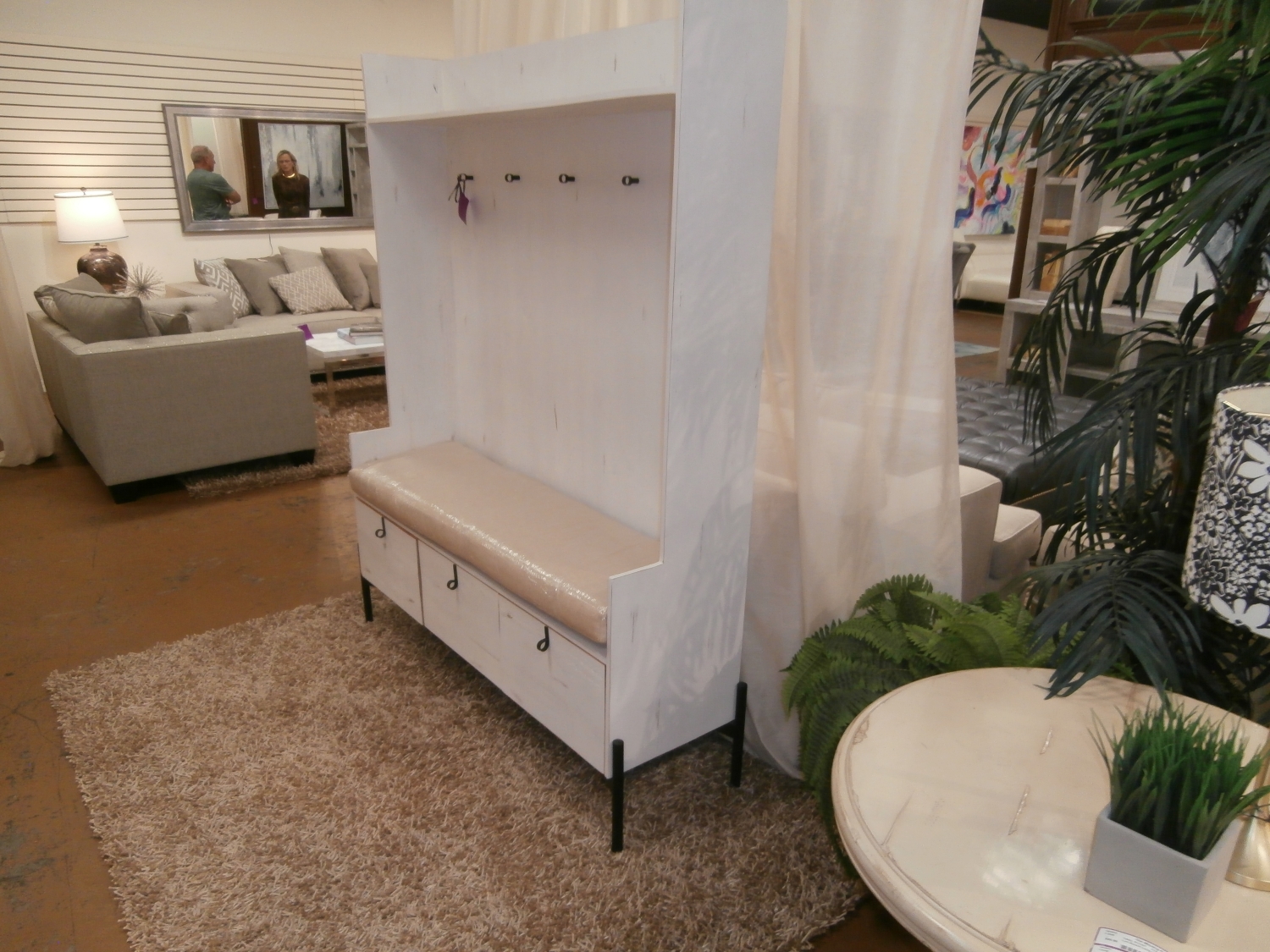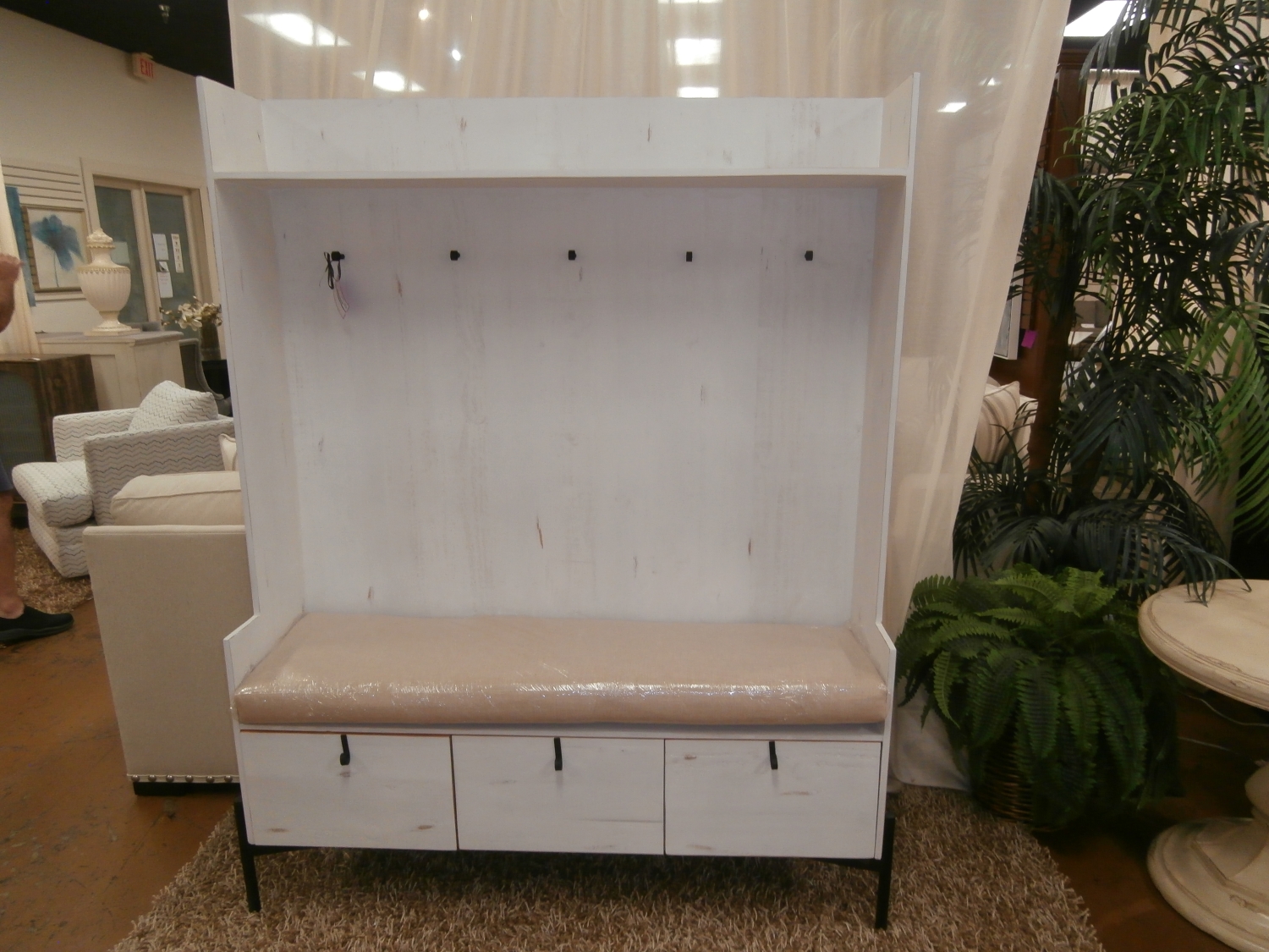 Solana hall tree with black metal accents measuring 56"W,17"D,73"H in sierra white.