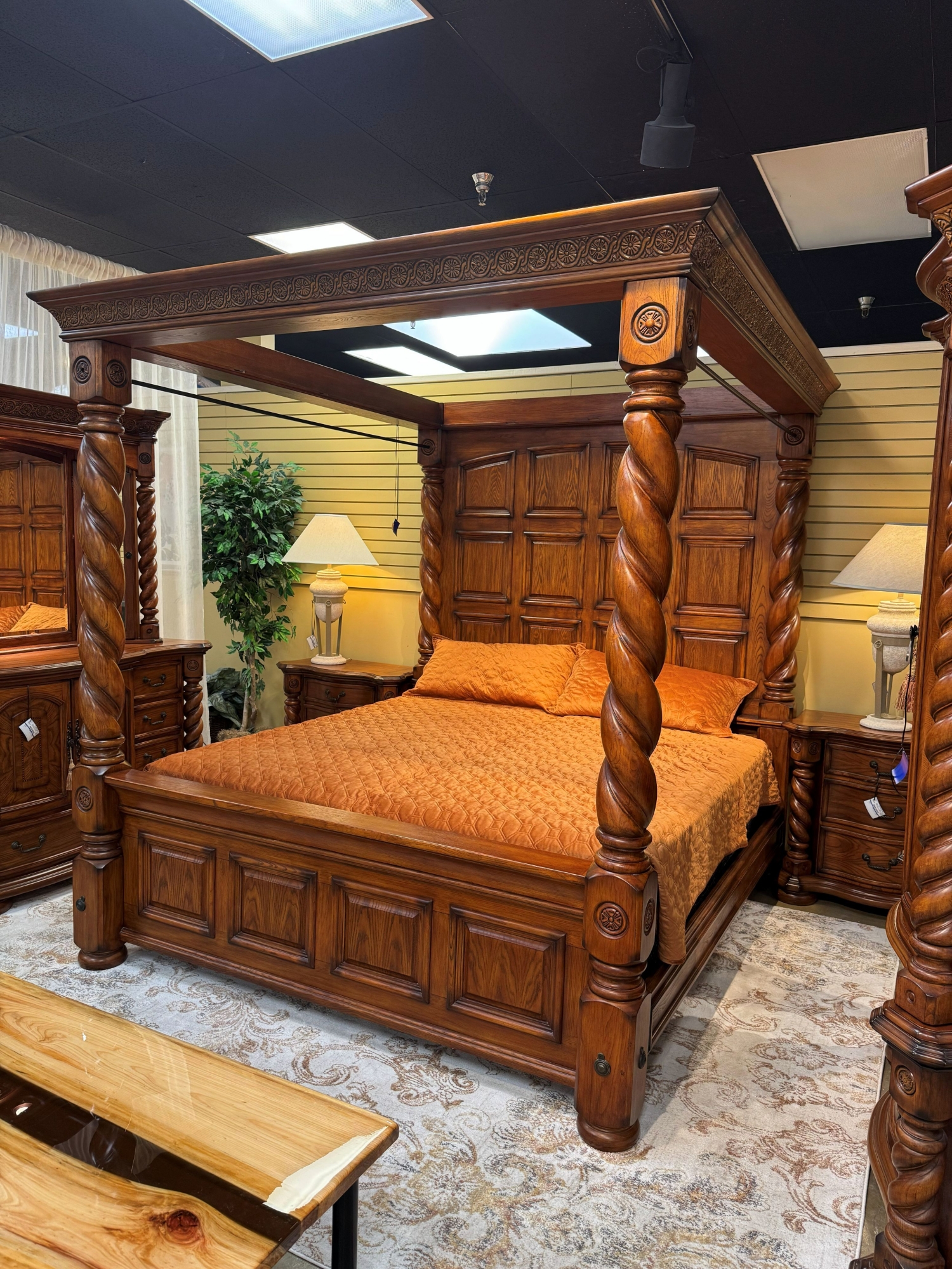 AICO Brittany Mantel canopy bed in a king size. Stunning! Love the barley twist posts & carved panel headboard. Make your master suite feel like a palace with this bed. At posting, we have the matching pieces.
