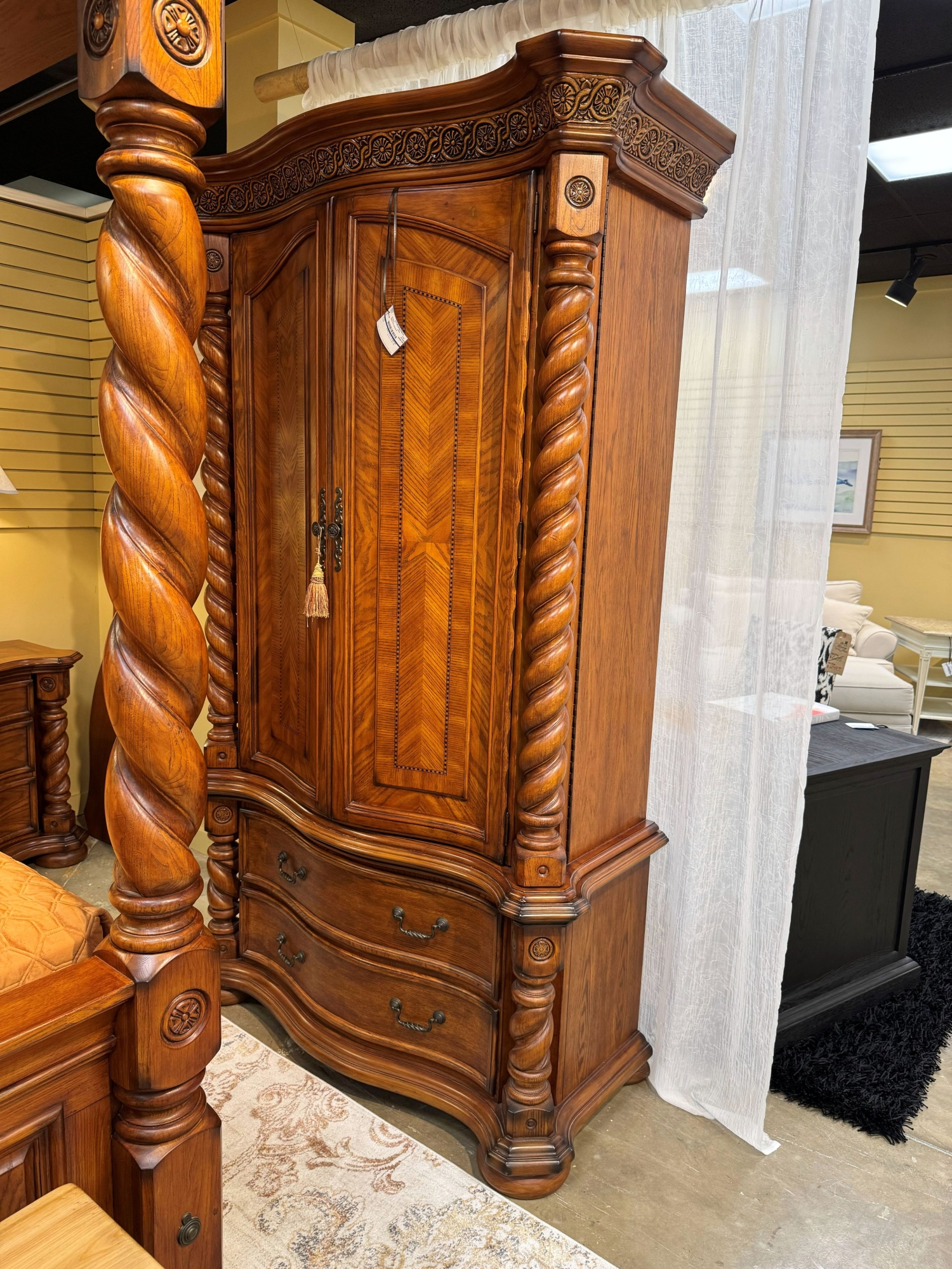 Item #553004. AICO Brittany Mantel canopy bed in a king size. Stunning! Love the barley twist posts & carved panel headboard. Make your master suite feel like a palace with this bed. At posting, we have the matching pieces.