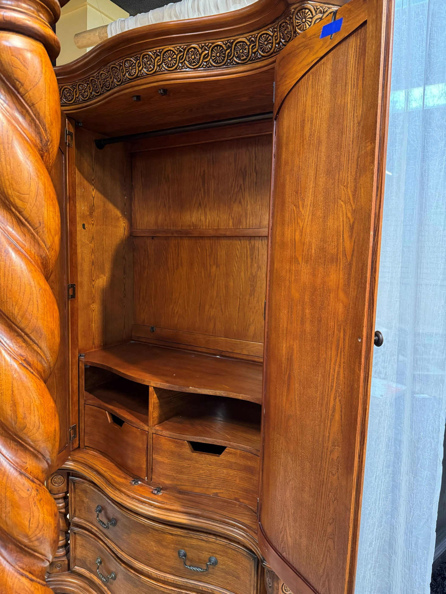AICO two piece traditional style armoire. There is a wardrobe bar inside with two drawers and two more drawers below. 56"wide x 24"deep x 88"high. At posting, we have the matching king bedroom set.