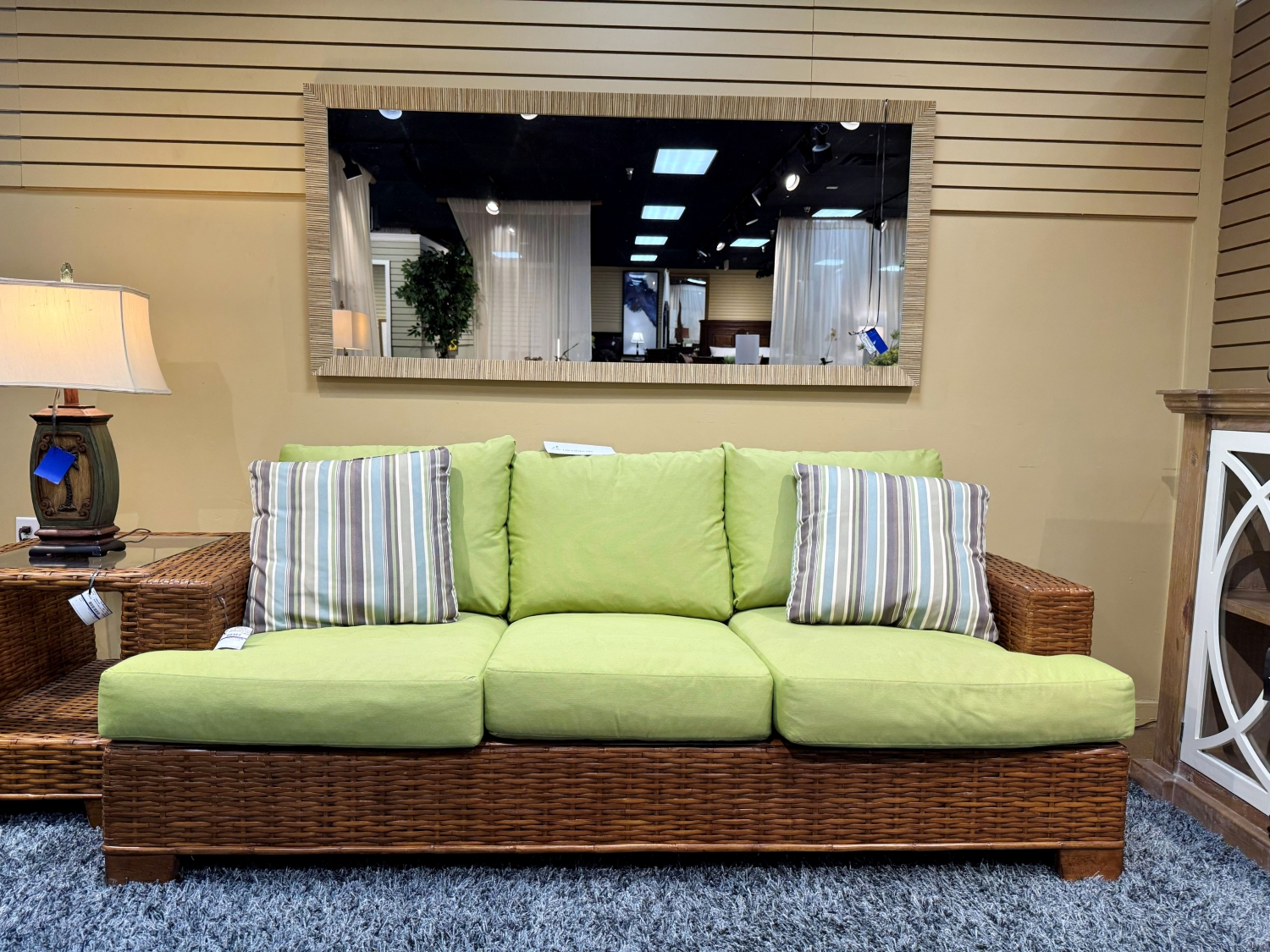 Braxton Culler tropical style wicker sleeper sofa with green upholstered cushions. Comes with two striped accent pillows. Offers style and function. Comes with air pump for mattress. 88"long x 40"deep x 33"high.