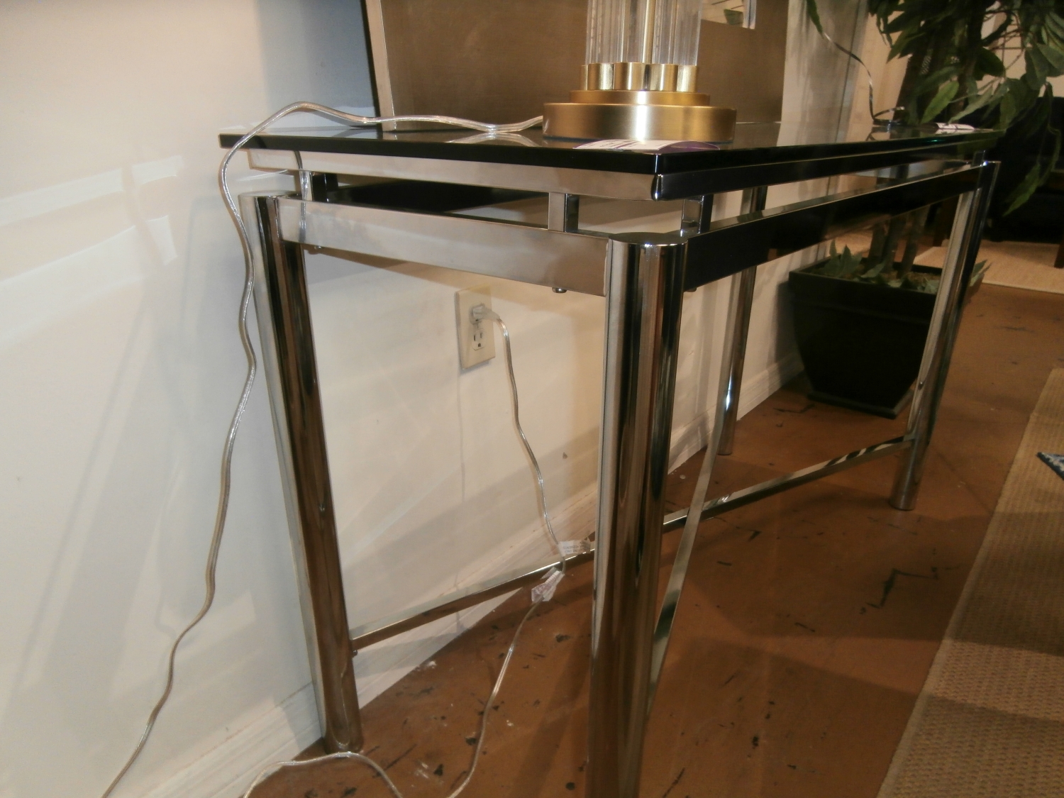 Glass and metal sofa table measuring 48"W,18"D,30"H in chrome.
