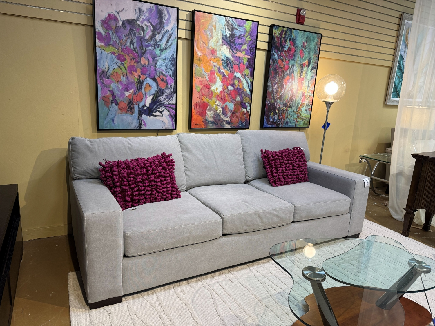 Matter Brothers Max Home contemporary style three seat sofa in a gray upholstery. Sleek, clean lines. Accent pillows sold separately. 94"long x 42"deep x 30"high. At posting, we have the matching chair.