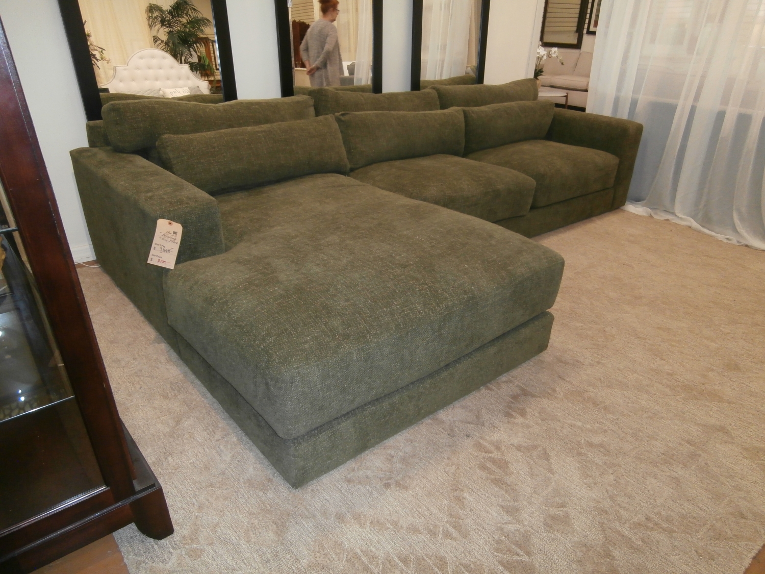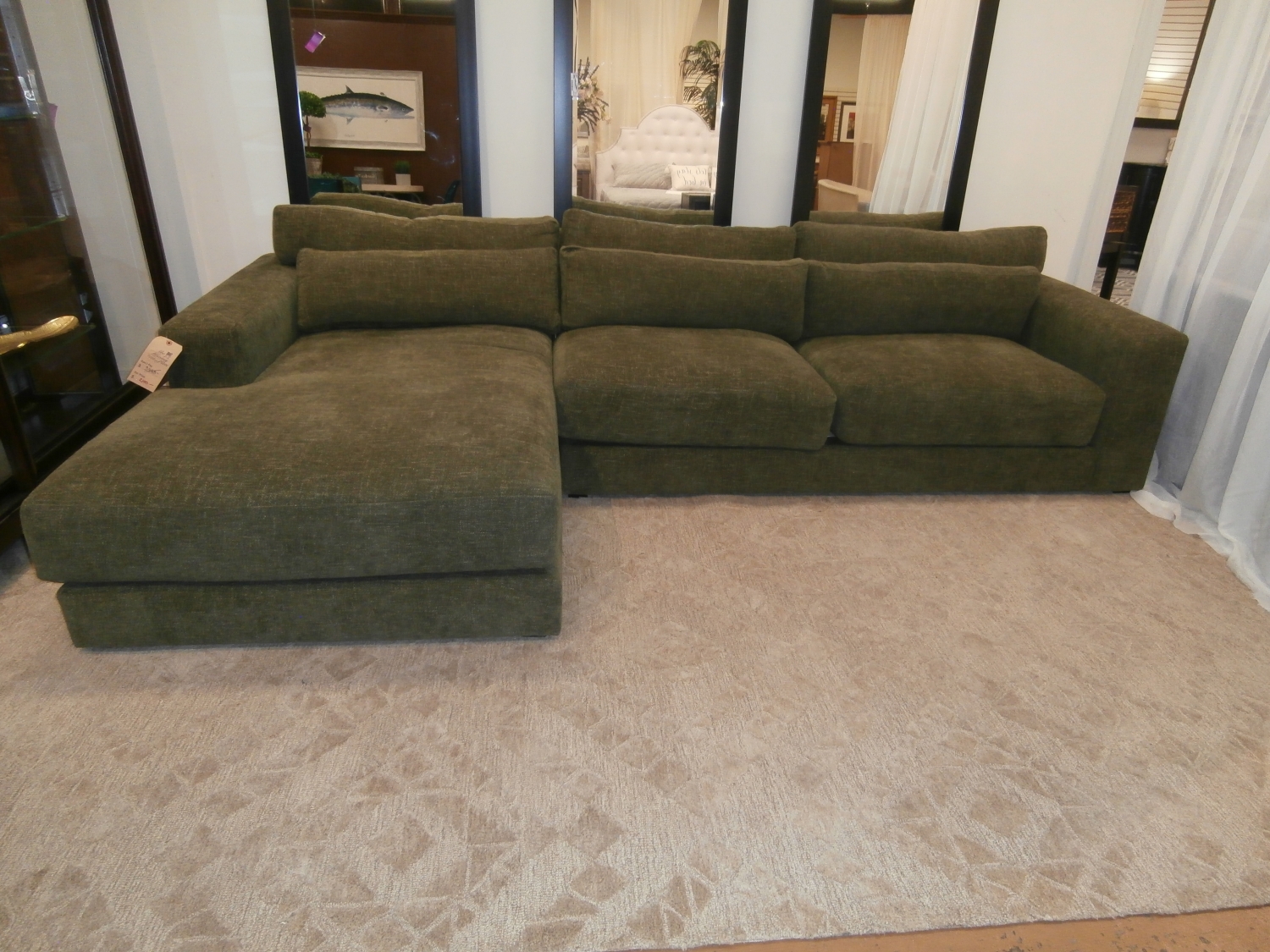 The C&B Retreat sectional, is a plush new hangout spot with a clean, modern look. Extra-wide arms provide a spot to park a book, tablet or bowl of popcorn. Measures 125"W,73"D,32"H in moss green.