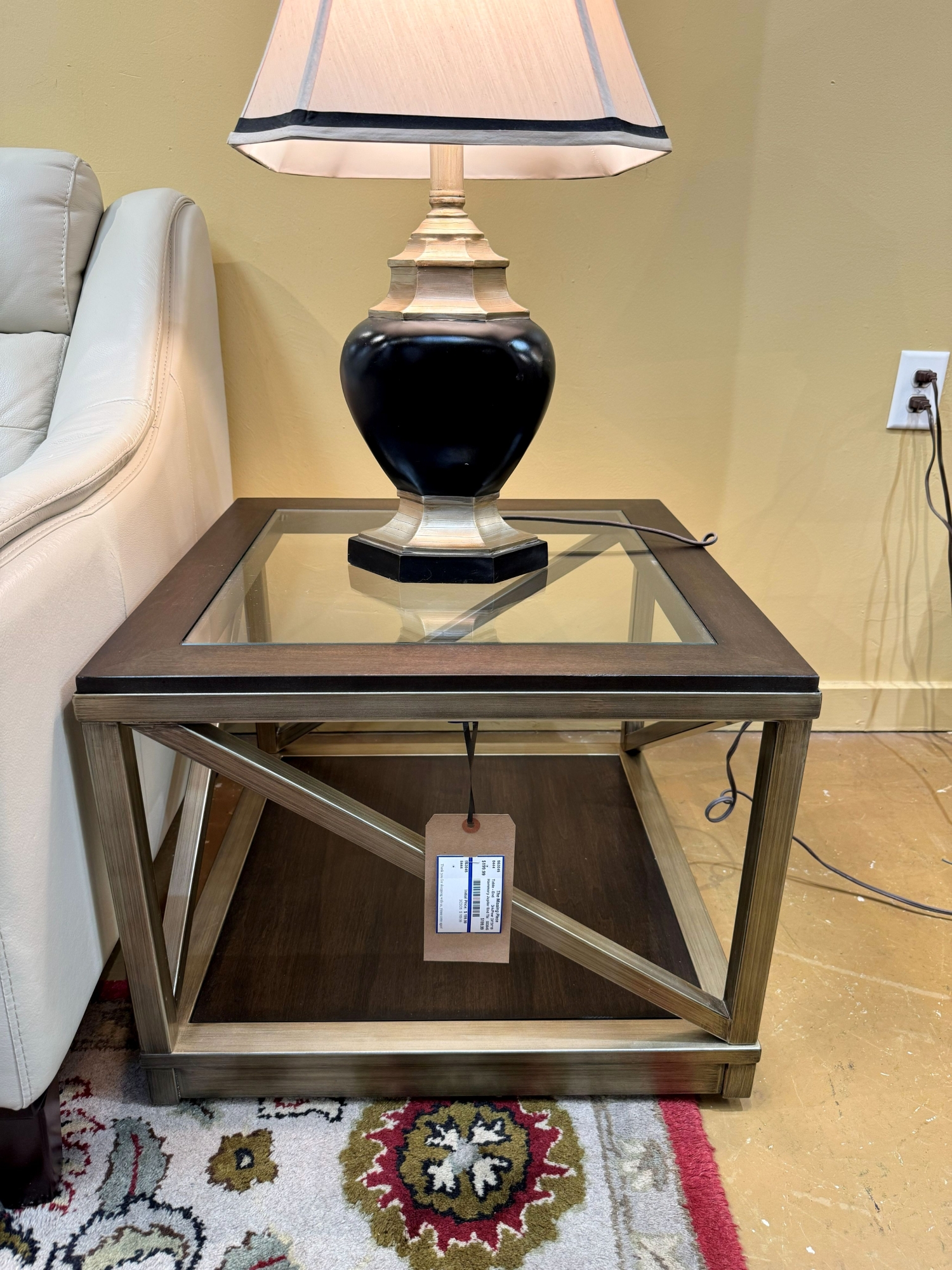 Hammary Jupiter transitional style glass top end table in a dark finish on metal frame with casters. There is one shelf below. 24"square x 19"high. At posting, we have two.