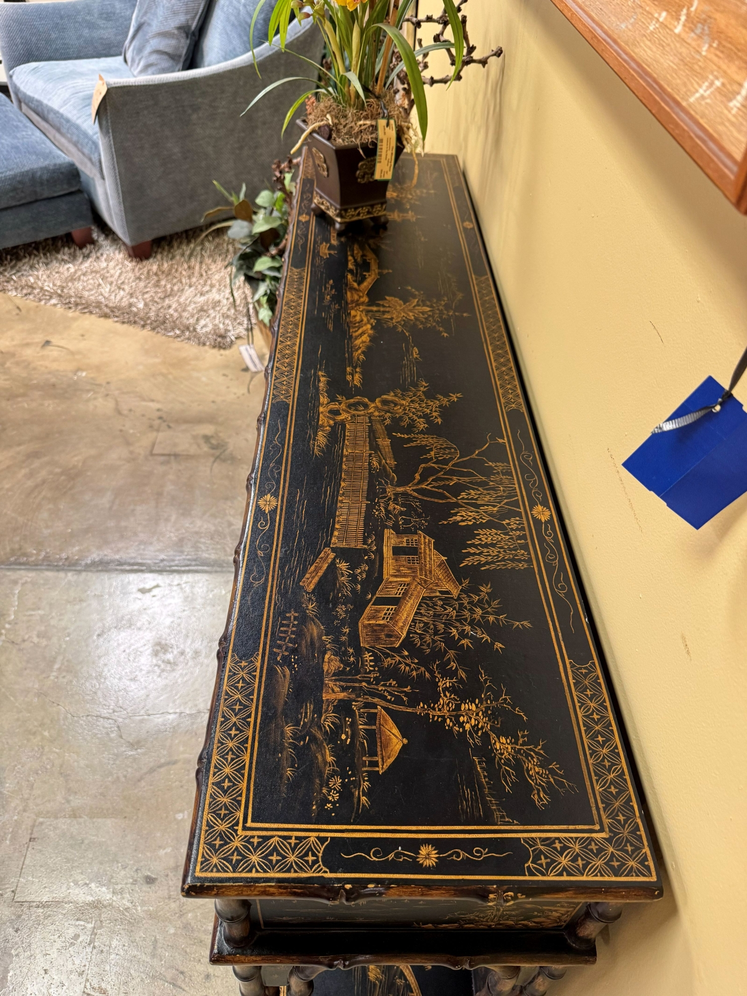 Sarreid Asian style chinoiserie console in black and gold. There are three drawers. Beautiful! Could be used in a living room or dining room. 55"long x 13"deep x 31"high.