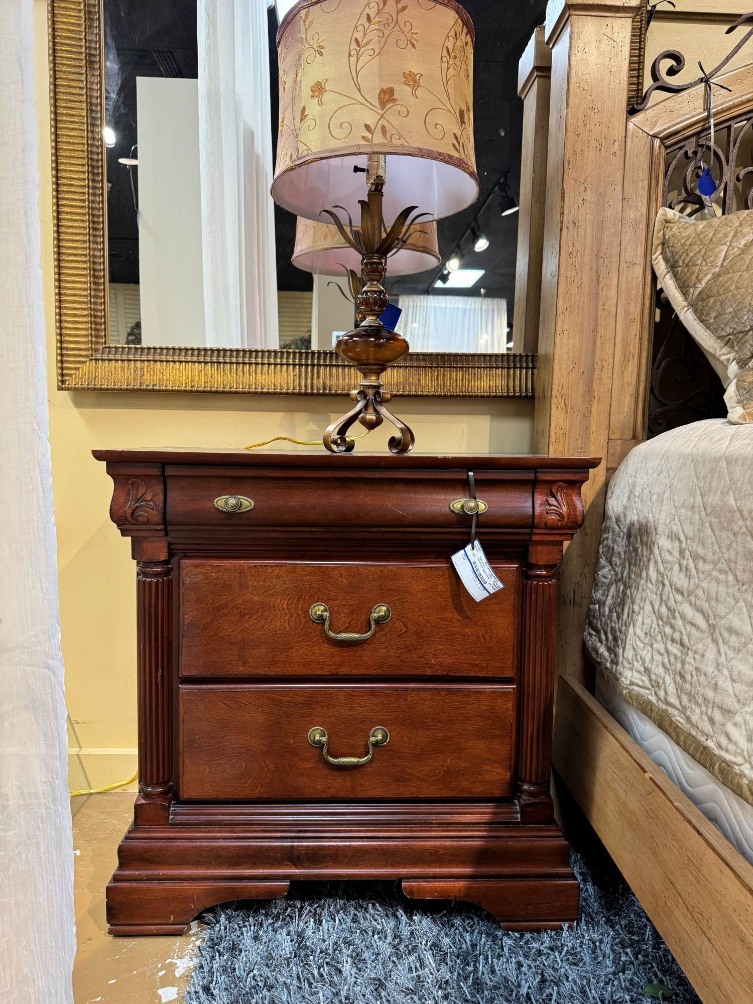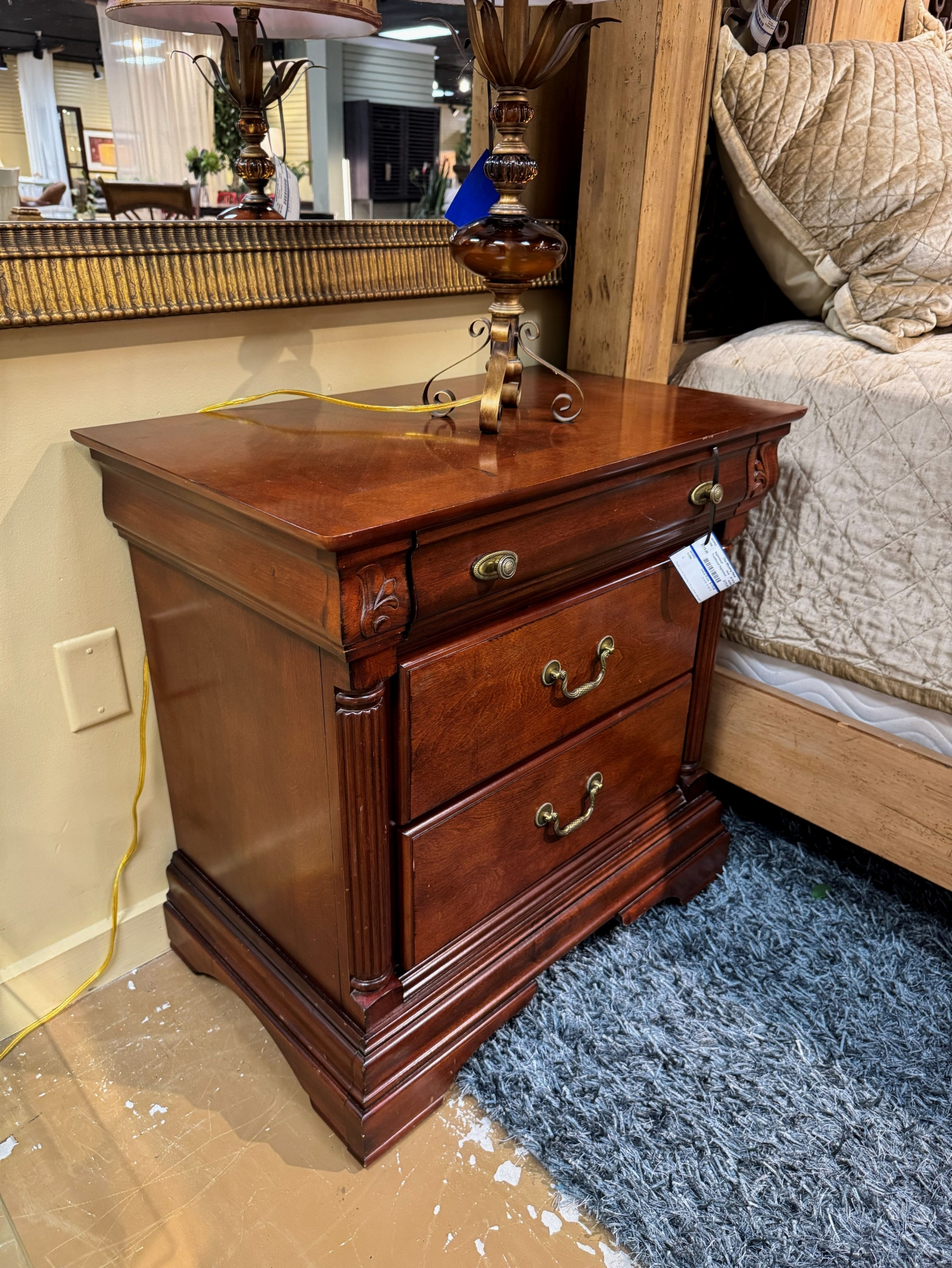 Traditional style nightstand in a rich dark finish. There are three drawers. 30"wide x 19"deep x 30"high.