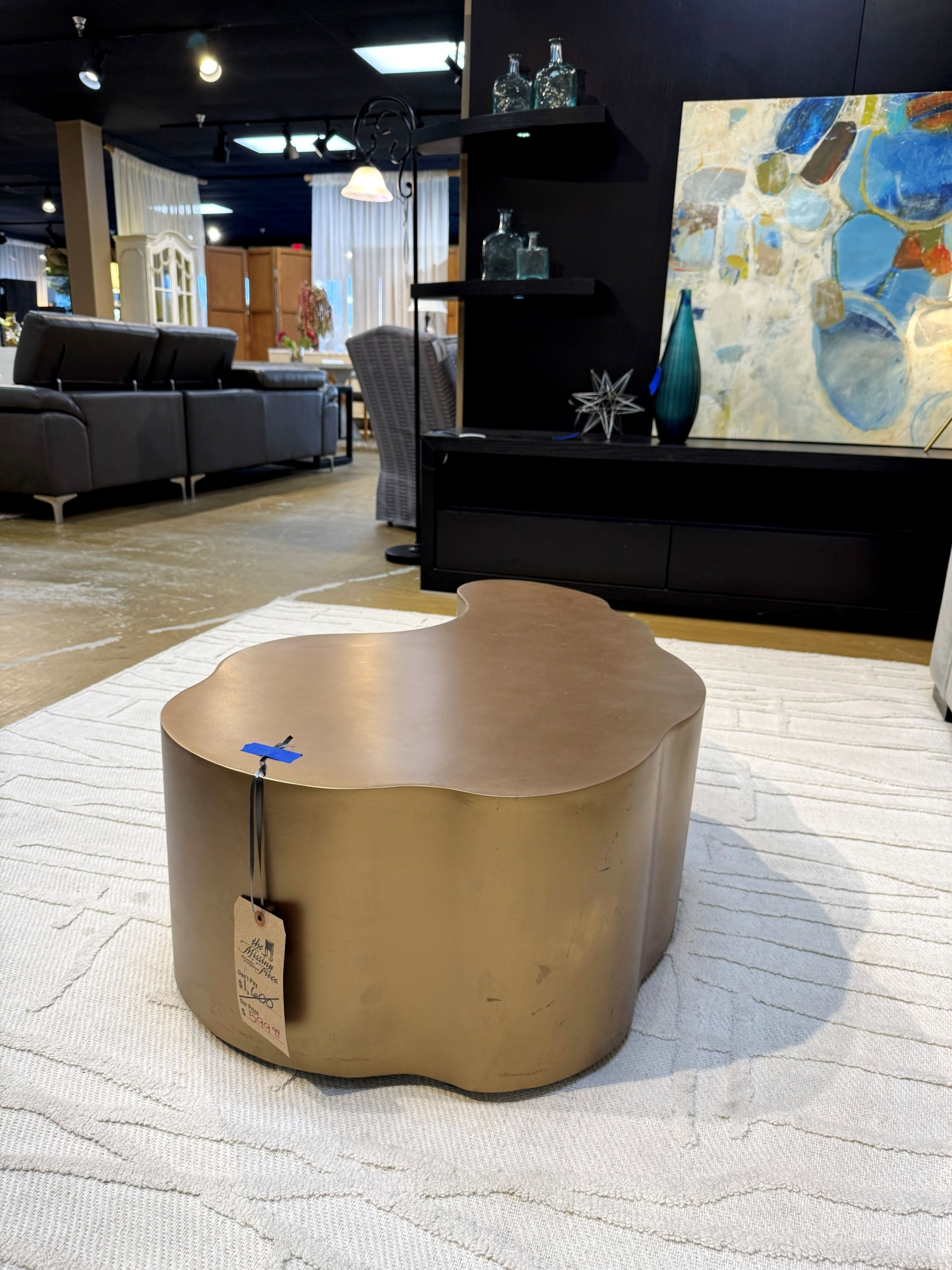 Arteriors Meadow modern shaped metal coffee table in an antique brass finish. 36"long x 25"wide x 14"high.